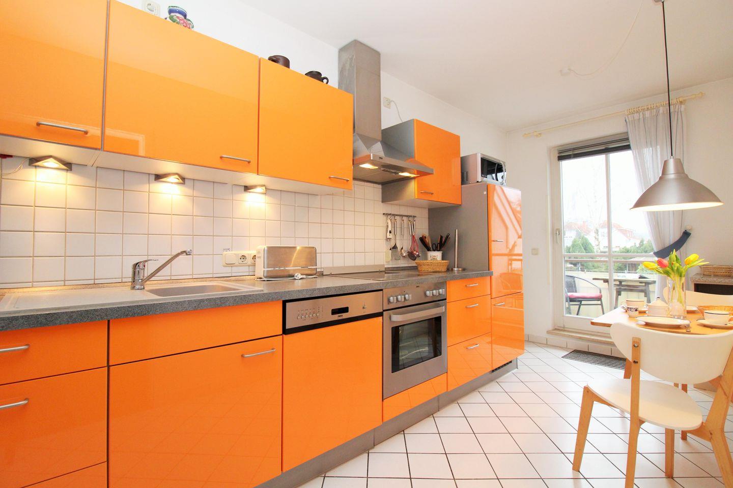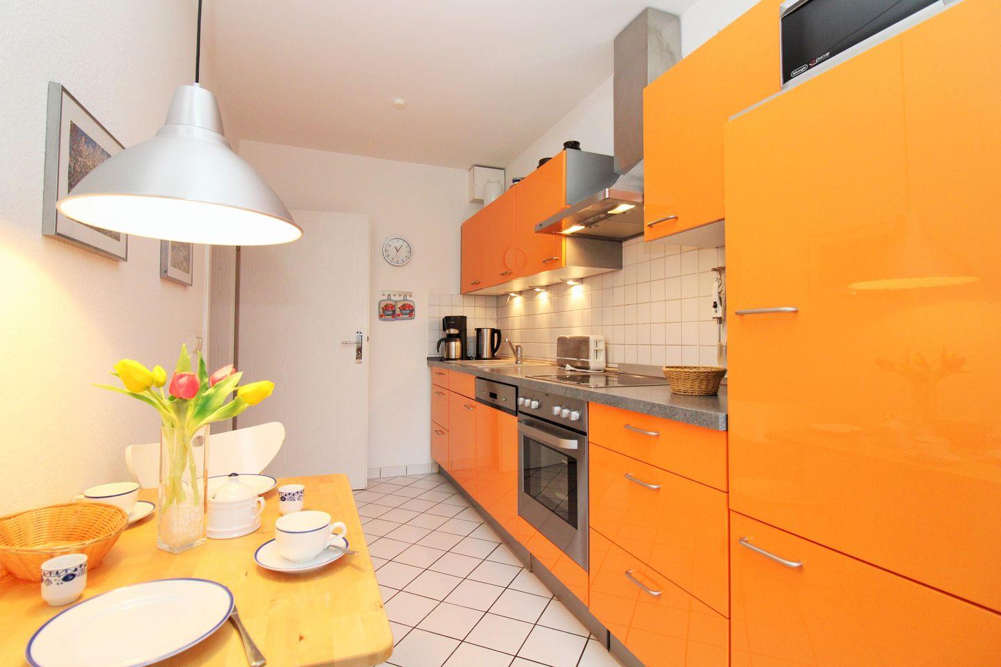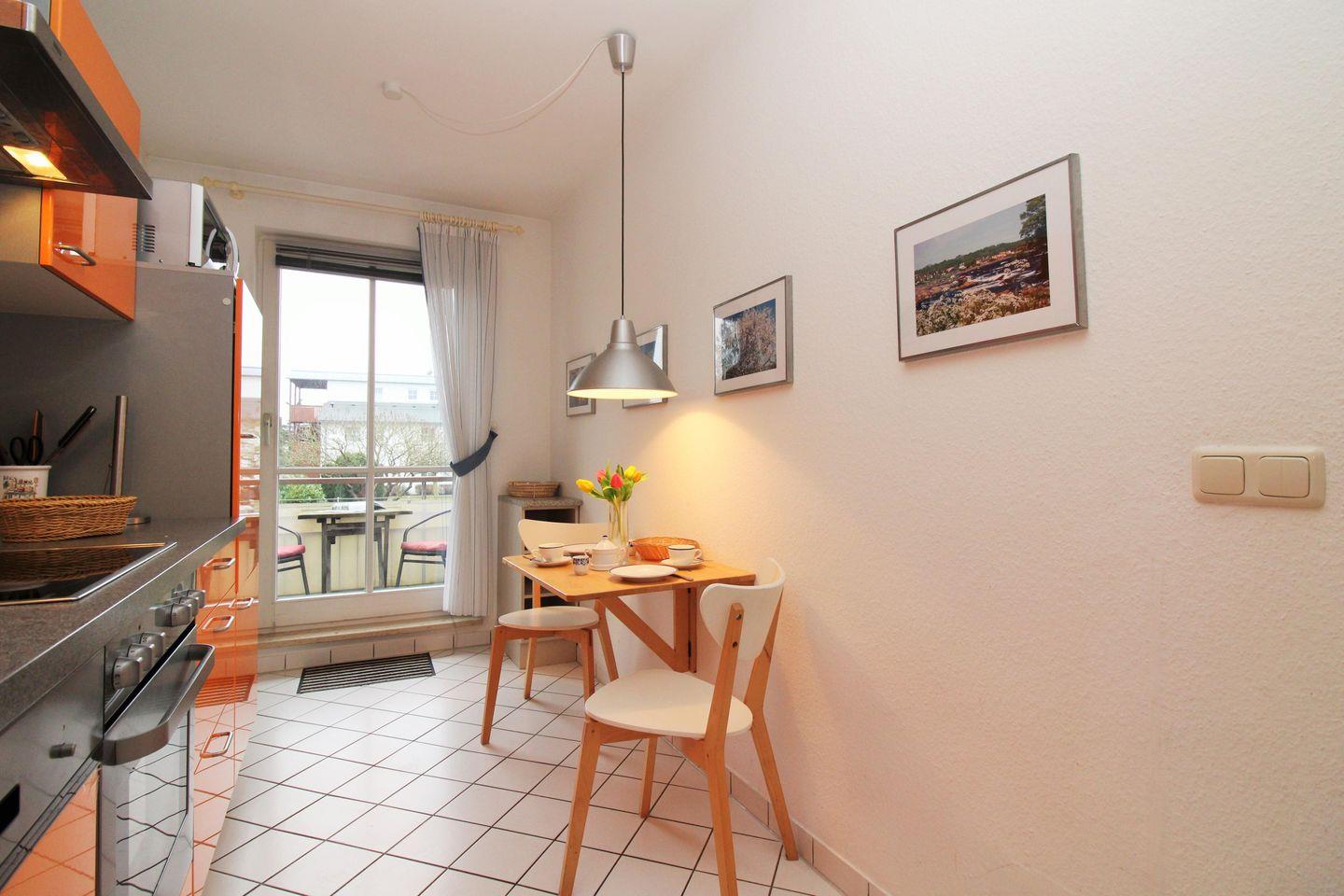Die separate Küche beinhaltet eine voll ausgestattete Einbauküchenzeile mit 4-Platten-Ceran-Kochfeld, Backofen, Dunstabzug, Mikrowelle, Kühlschrank mit Gefrierfach, Geschirrspülmaschine, Kaffeemaschine, Wasserkocher und Toaster. Die Küche ist mit Geschirr, Gläsern, Besteck und Töpfen vollständig ausgestattet. Von hier aus haben Sie direkten Zugang zu einem der 3 Balkone (ca. 3,5 m² / nach Süden ausgerichtet / mit Tisch und Stühlen).