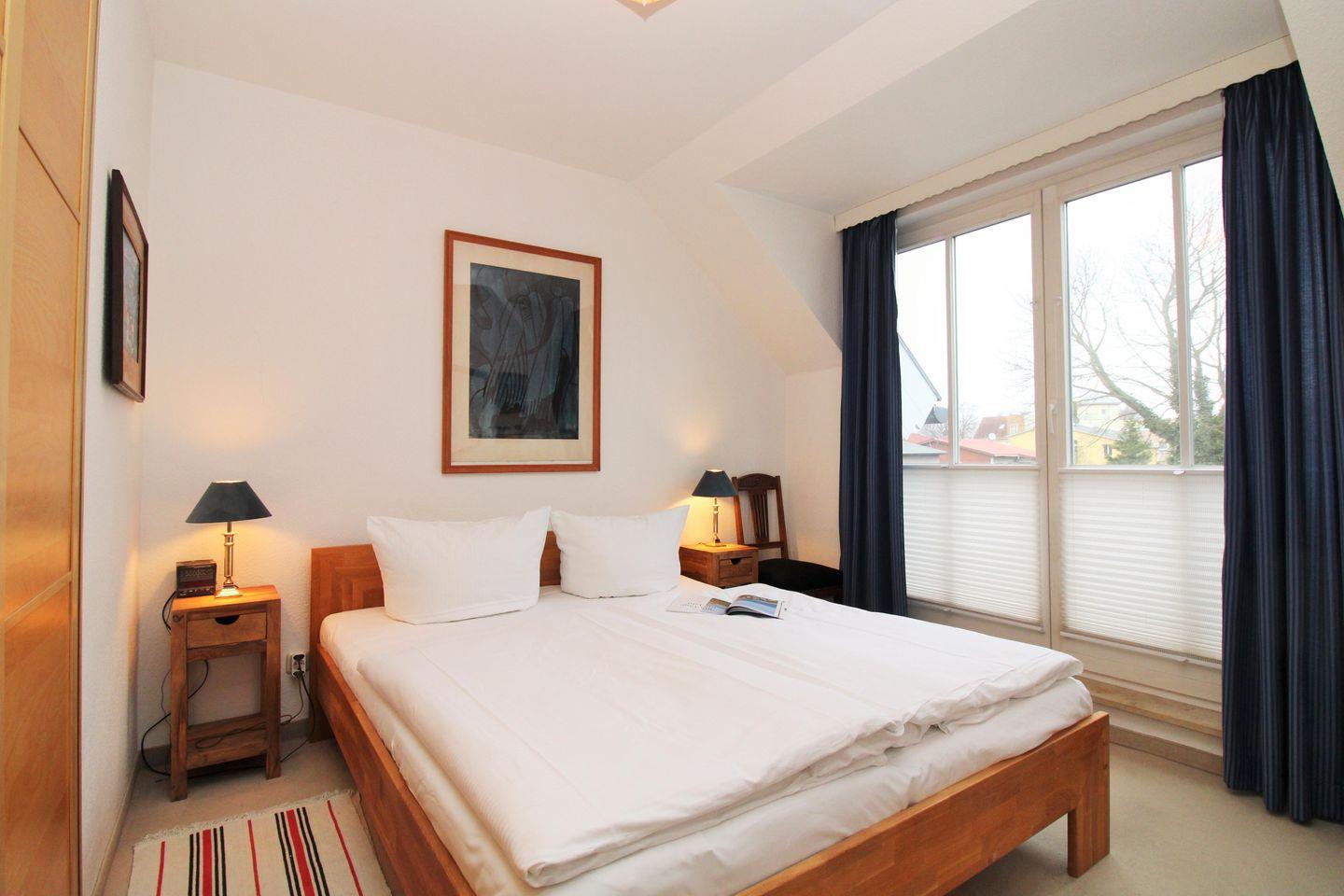 Das gemütliche 1. Schlafzimmer (im 1. OG) ist mit einem bequemen Doppelbett, Nachttischen sowie einem geräumigen Kleiderschrank eingerichtet und verfügt ebenfalls über einen direkten Zugang zu einem der Balkone (ca. 5 m² / nach Norden ausgerichtet / mit Tisch und Stühlen).