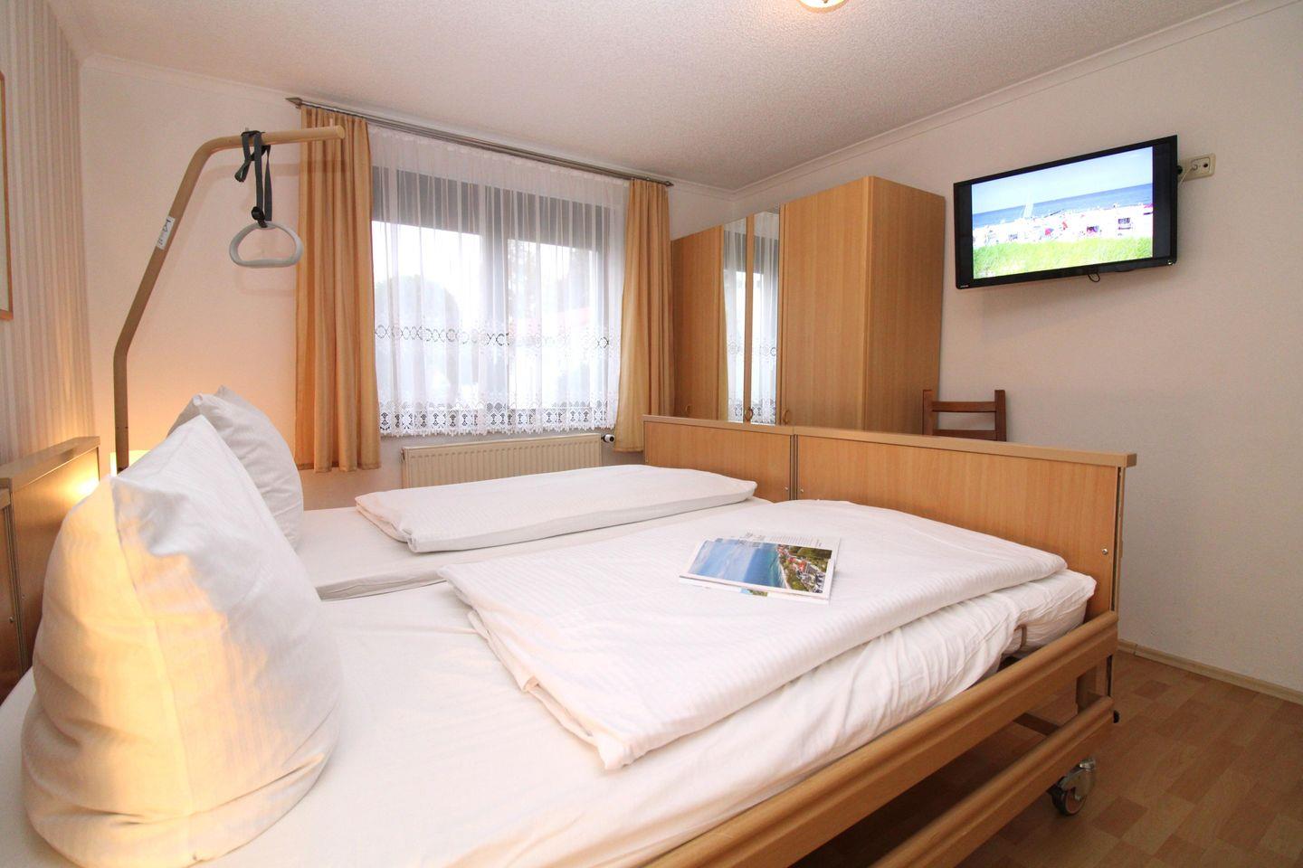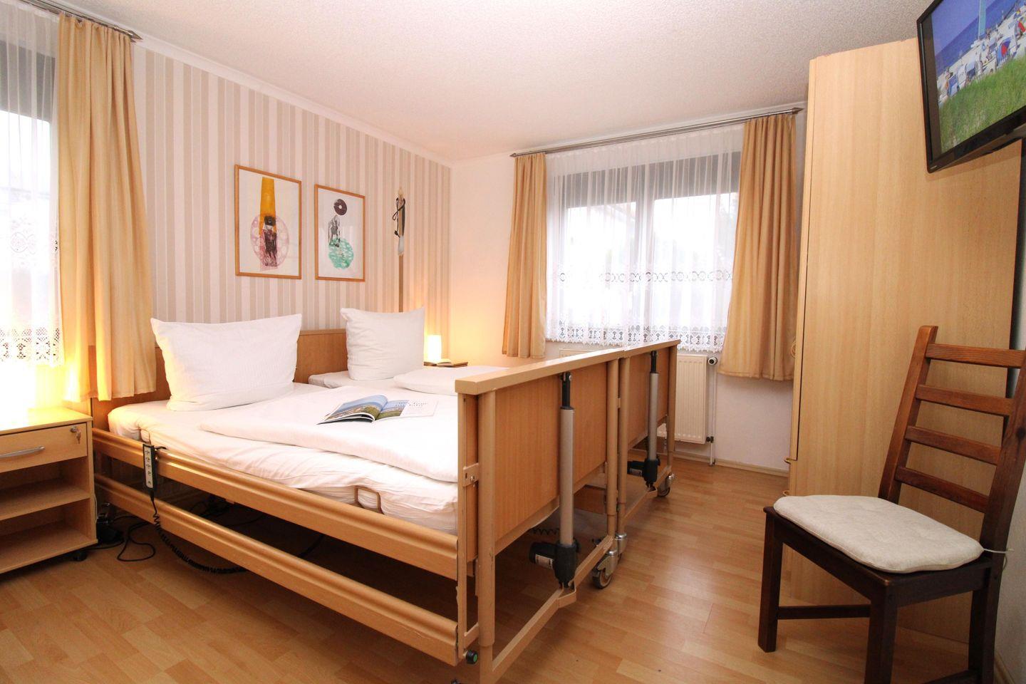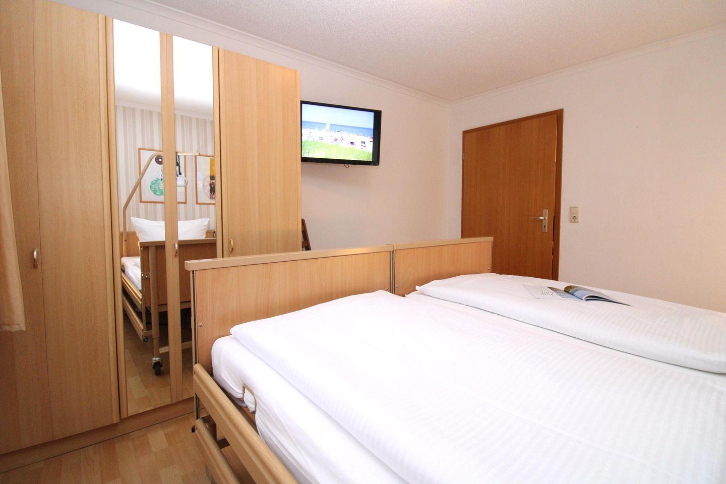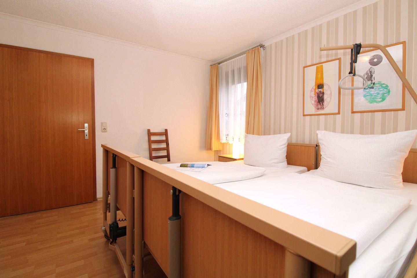 Das helle und geräumige 1. Schlafzimmer ist mit zwei bequemen und elektrisch verstellbaren Pflegebetten, Nachttischen, einem geräumigen Kleiderschrank sowie einem Stuhl eingerichtet. Darüber hinaus steht Ihnen in diesem Zimmer ein weiteres TV-Gerät zur Verfügung.