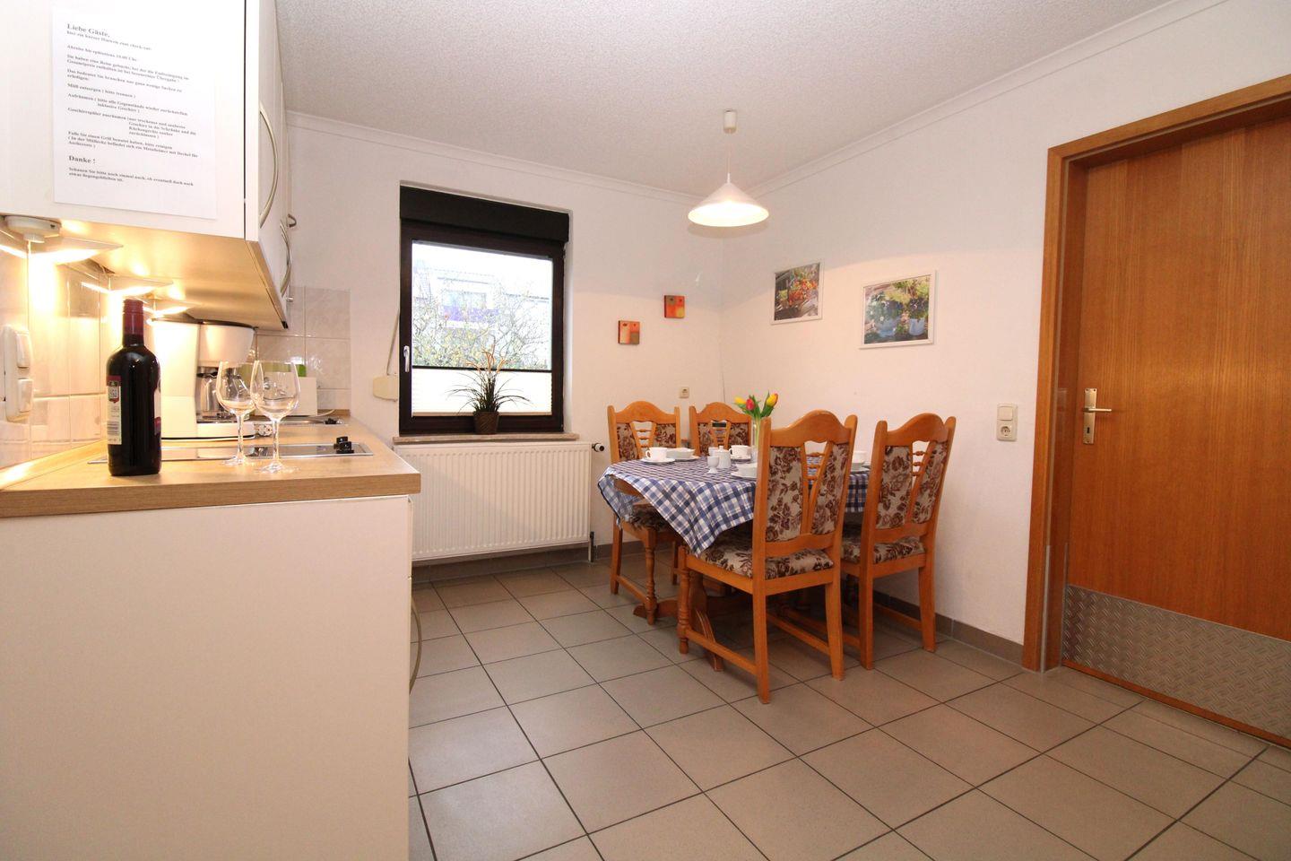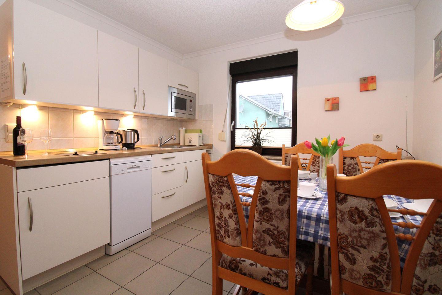 Der separate Küchen- und Essbereich beinhaltet eine voll ausgestattete Einbauküchenzeile mit 2-Zonen-Ceran-Kochfeld, Mikrowelle, Kühlschrank, Geschirrspülmaschine, Wasserkocher, Kaffeemaschine, Toaster sowie einen Esstisch mit 4 Stühlen. Die Küche ist mit Geschirr, Gläsern, Besteck und Töpfen vollständig ausgestattet.