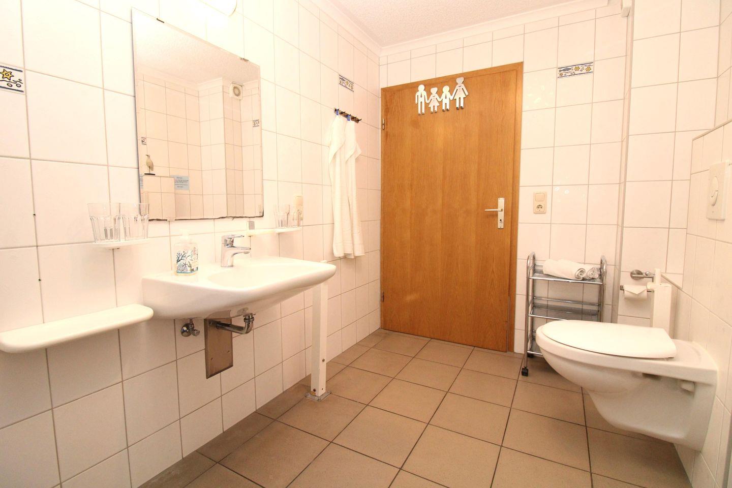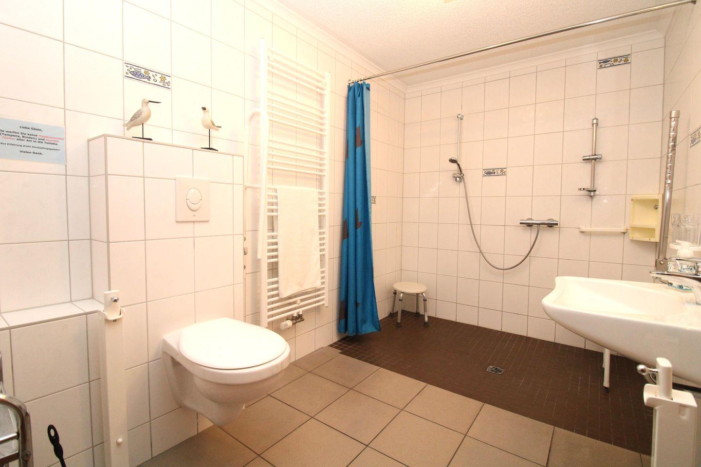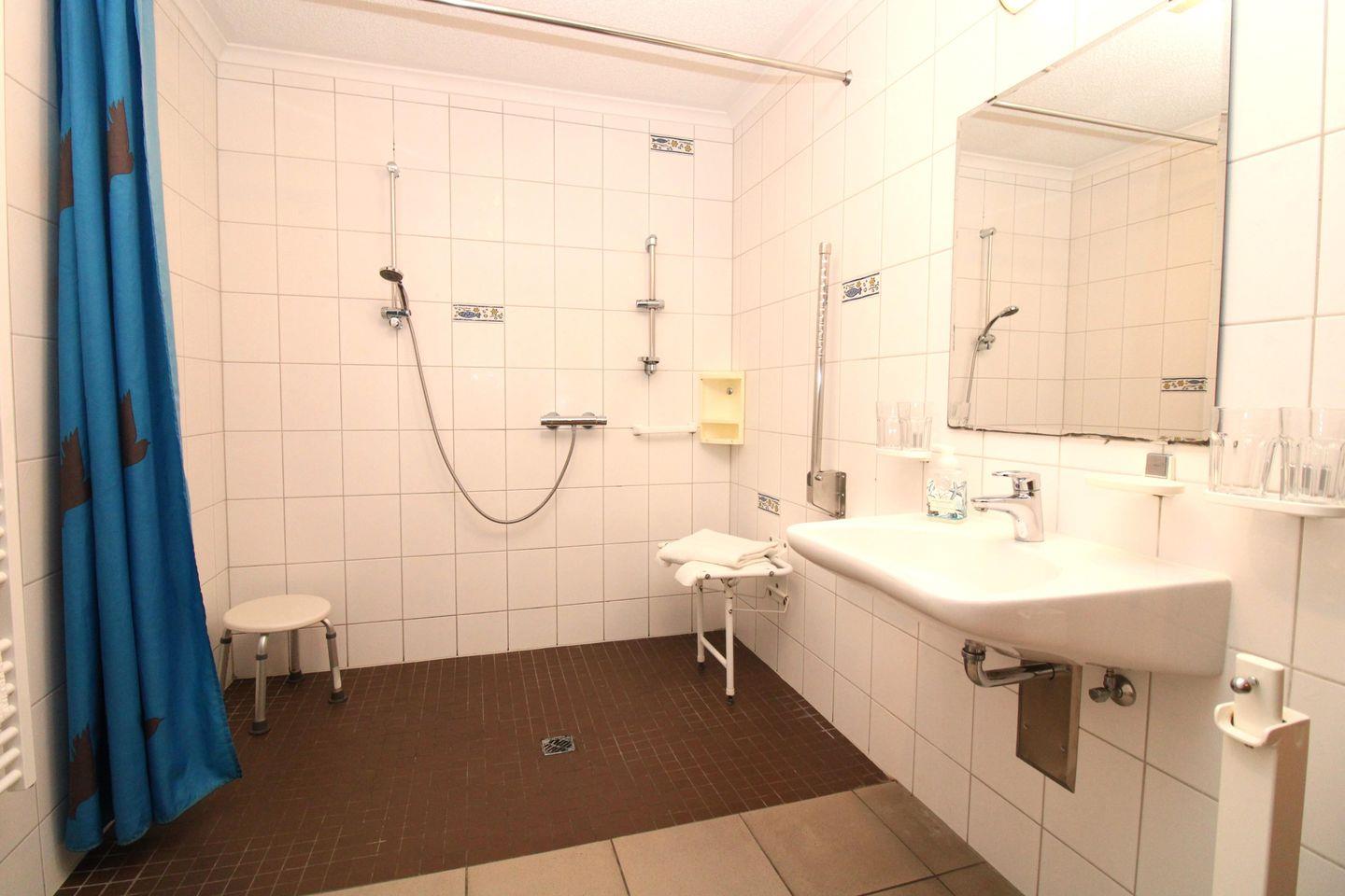 Das rollstuhlgerechte und sehr geräumige Badezimmer verfügt über eine bodenebene befahrbare Dusche mit klappbarem Duschsitz, WC, Waschbecken, Handtuchheizkörper, Kosmetikspiegel, Föhn sowie ausreichend Ablagemöglichkeiten.