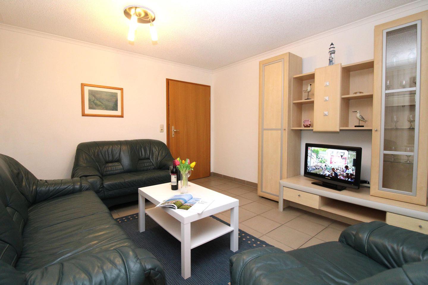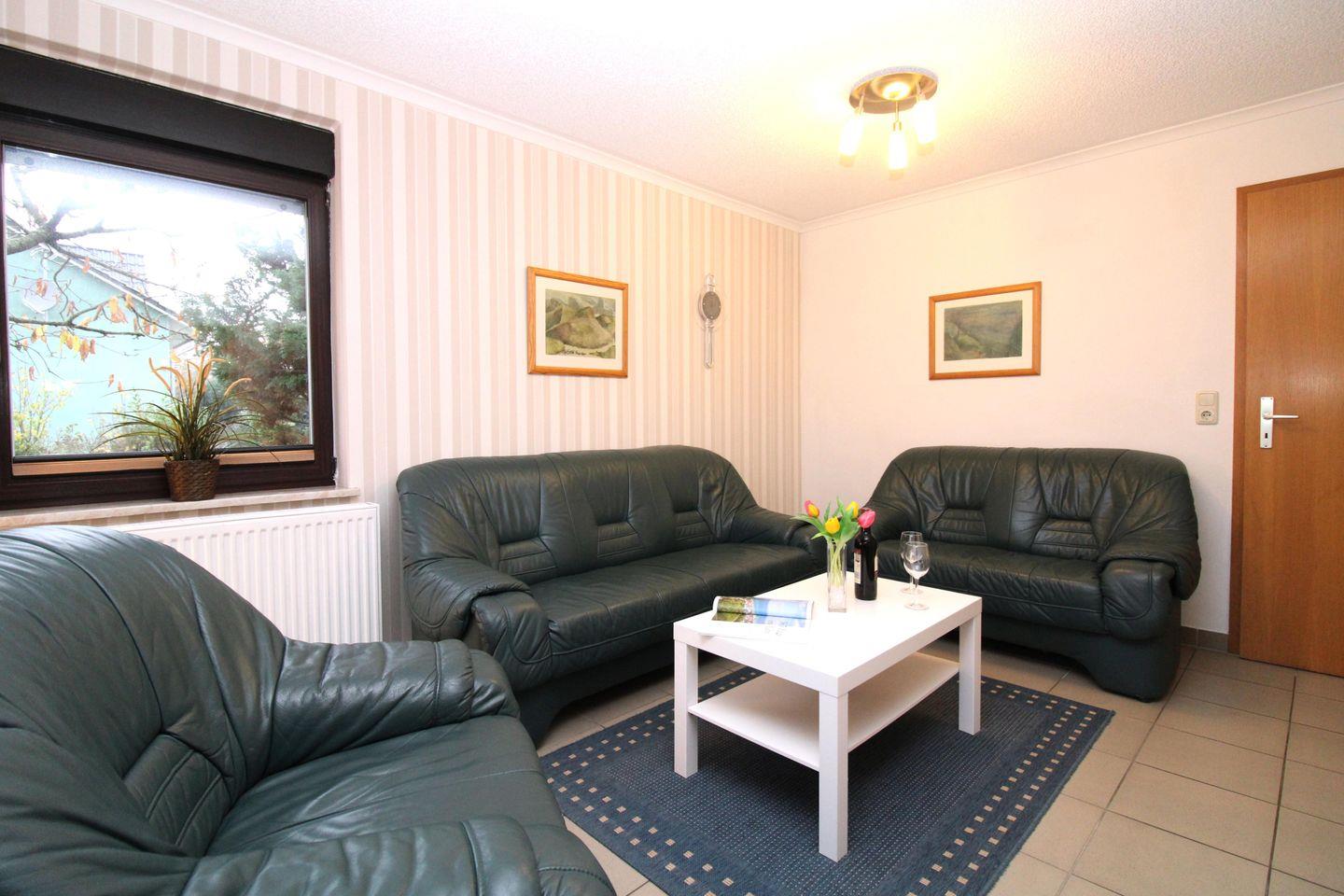 Das freundliche und helle Wohnzimmer verfügt über eine Sitzgruppe mit zwei bequemen Couchen, einen Sessel und Couchtisch sowie eine große Wohnwand mit verschiedenen Schränken und Regalen. Vom Wohnzimmer aus haben Sie direkten Zugang zu der ca. 10 m² großen, sonnigen sowie teilweise überdachten Terrasse (nach Süden ausgerichtet) mit Terrassenmöbeln. Hier sitzen Sie entspannt und gemütlich im Grünen und können abends bei einem guten Glas Wein in Ruhe die lauen Sommernächte genießen!