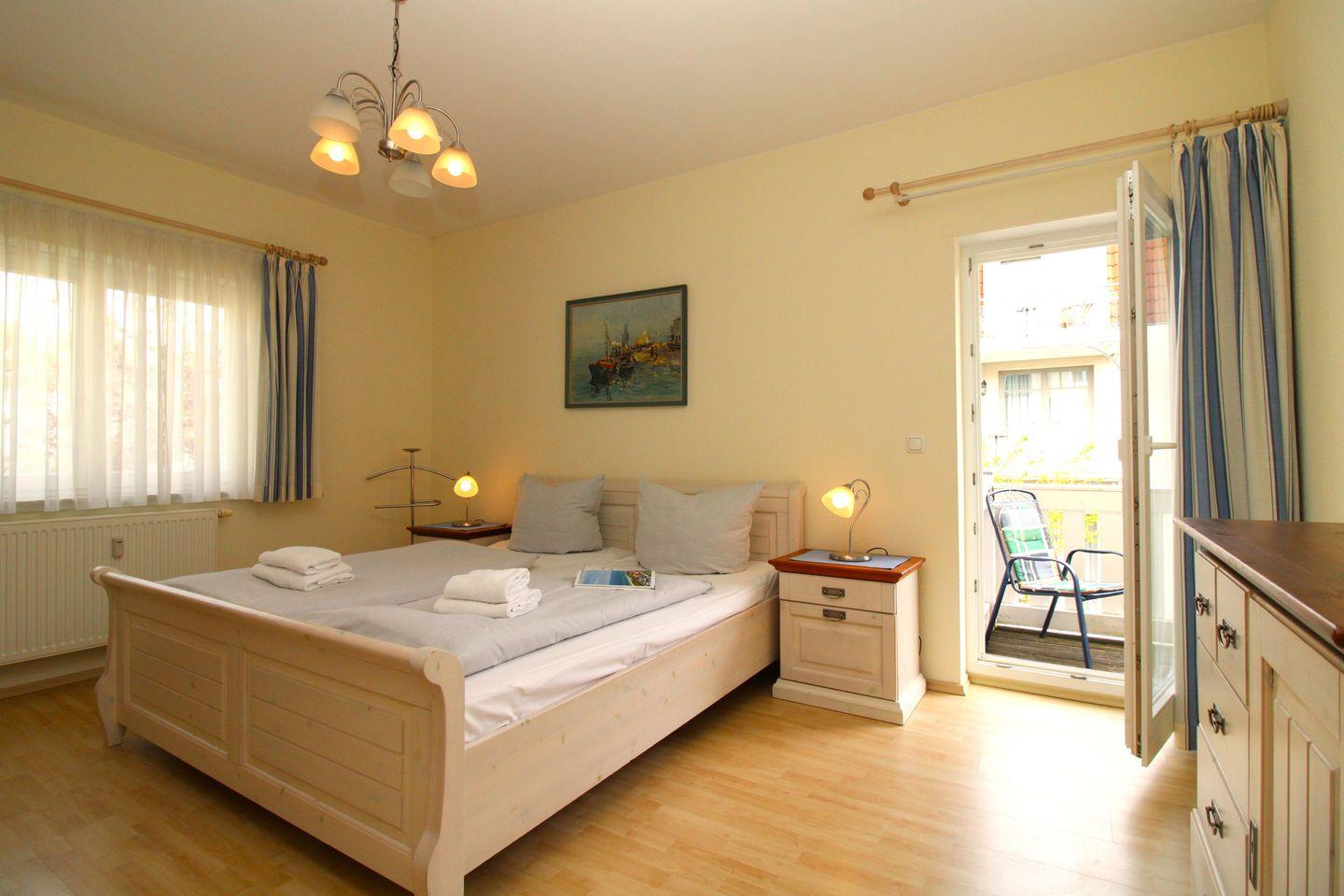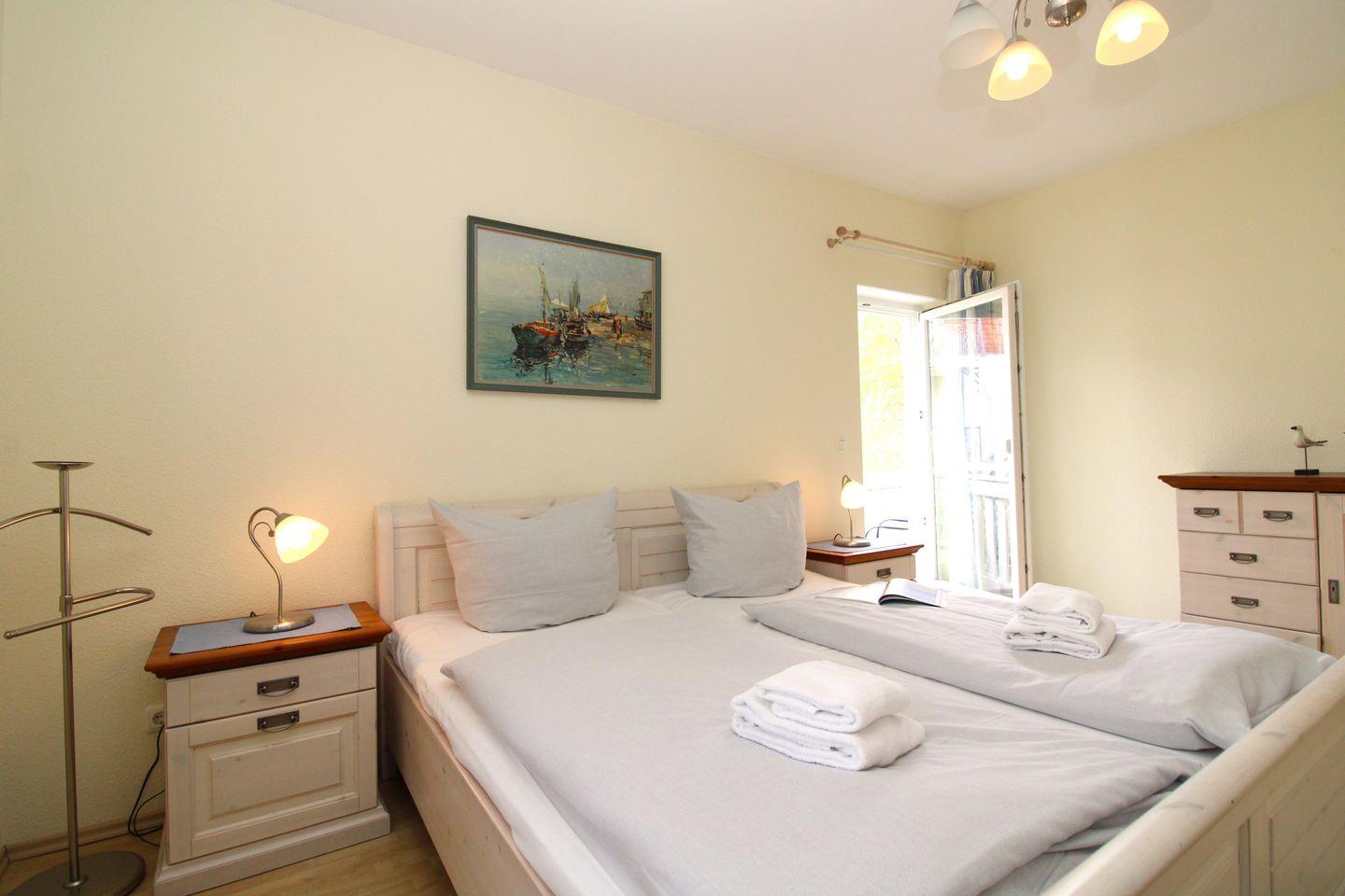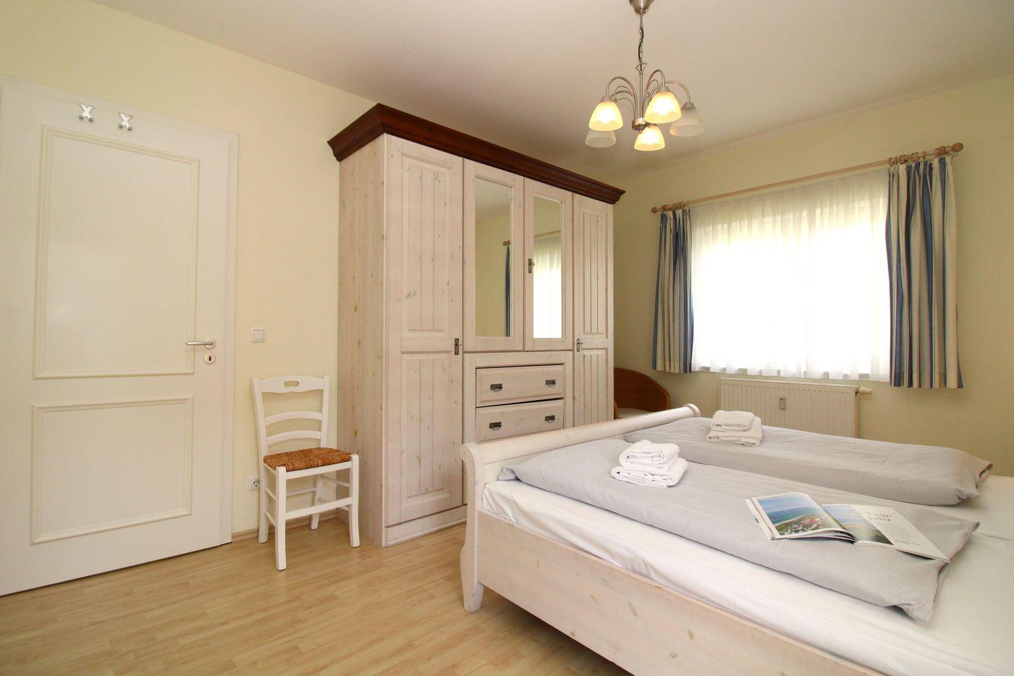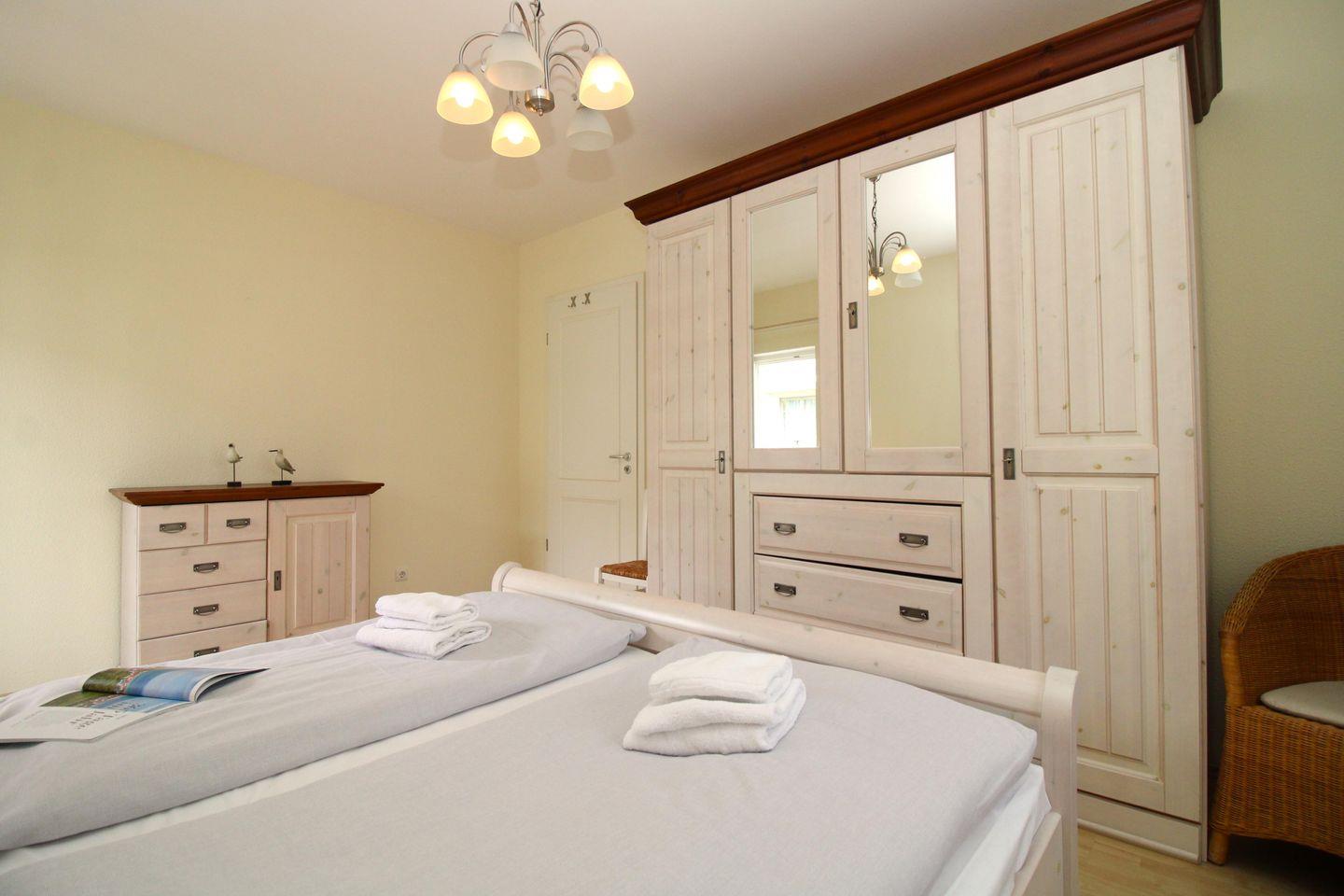 Das sehr geräumige und freundliche 1. Schlafzimmer im Landhausstil ist mit einem bequemen Doppelbett, Nachttischen, einer Kommode sowie einem geräumigen Kleiderschrank eingerichtet.