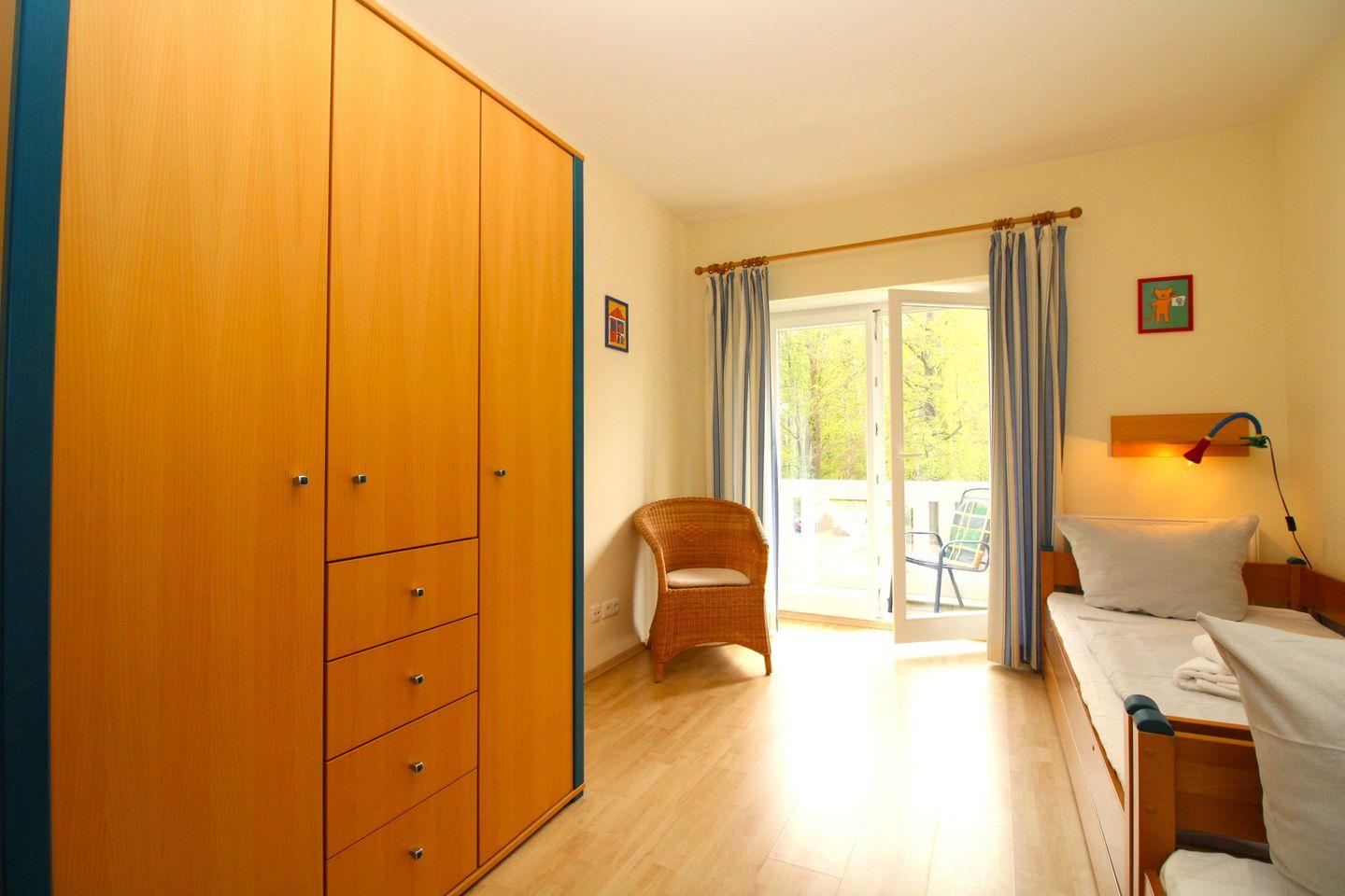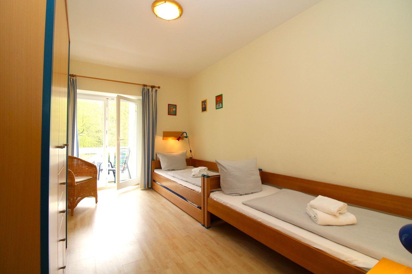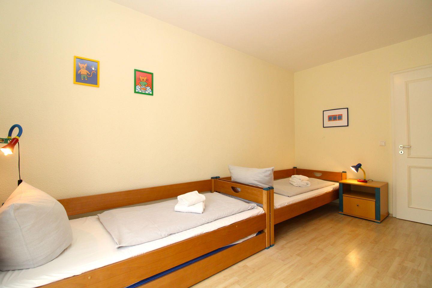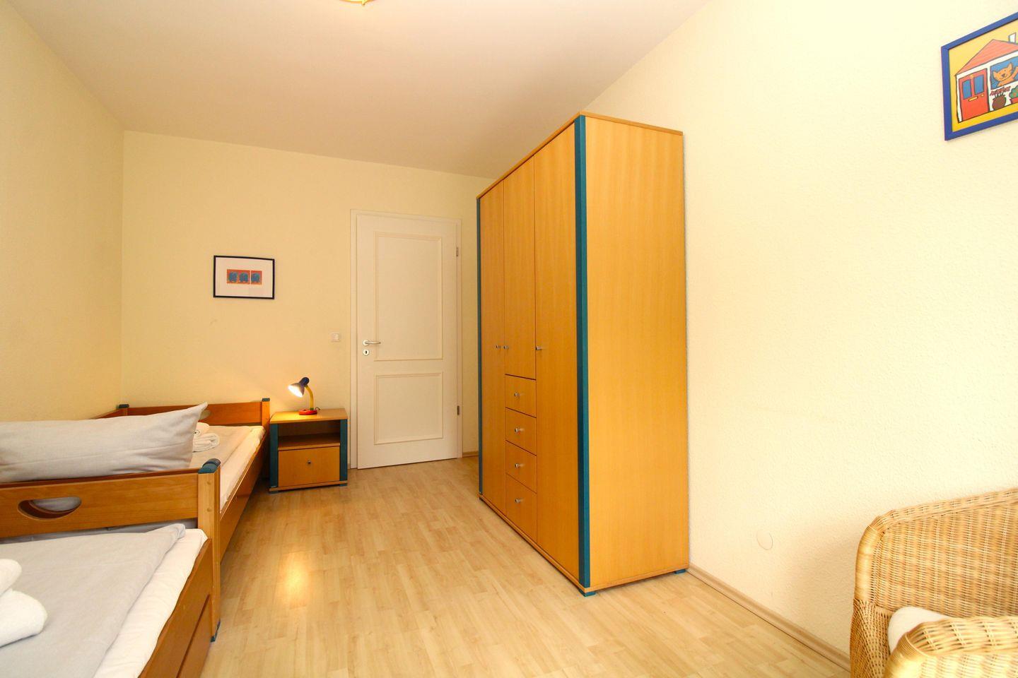 Das freundliche, helle und zusätzliche 2. Schlafzimmer verfügt über 2 getrennt stehende Einzelbetten sowie einen geräumigen Kleiderschrank. Von diesem Raum haben Sie ebenfalls Zugang zu einem der Balkone. Eine zusätzliche bequeme Schlafmöglichkeit für eine weitere 5. Person bietet ein ausziehbares Bett im 2. Schlafzimmer.