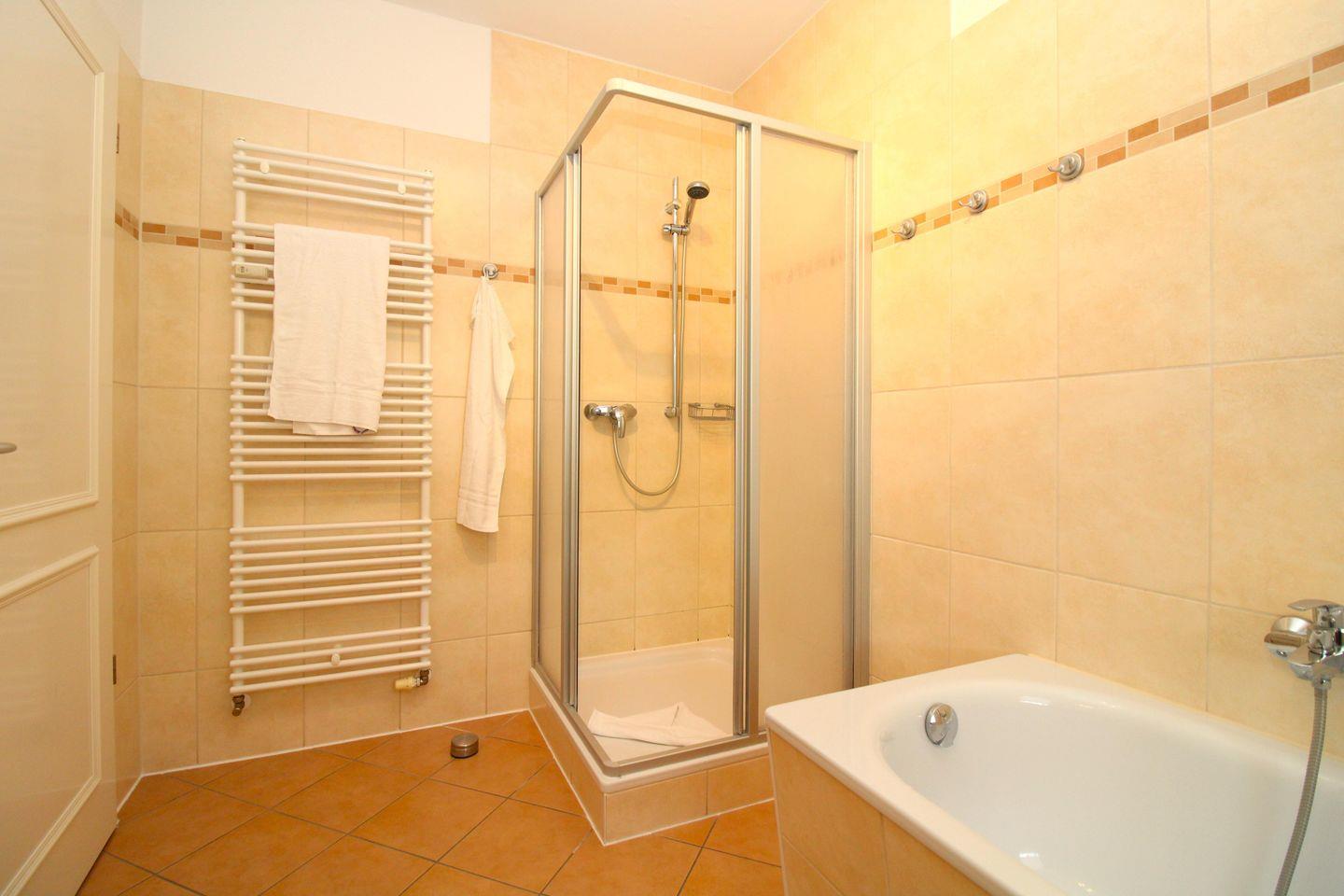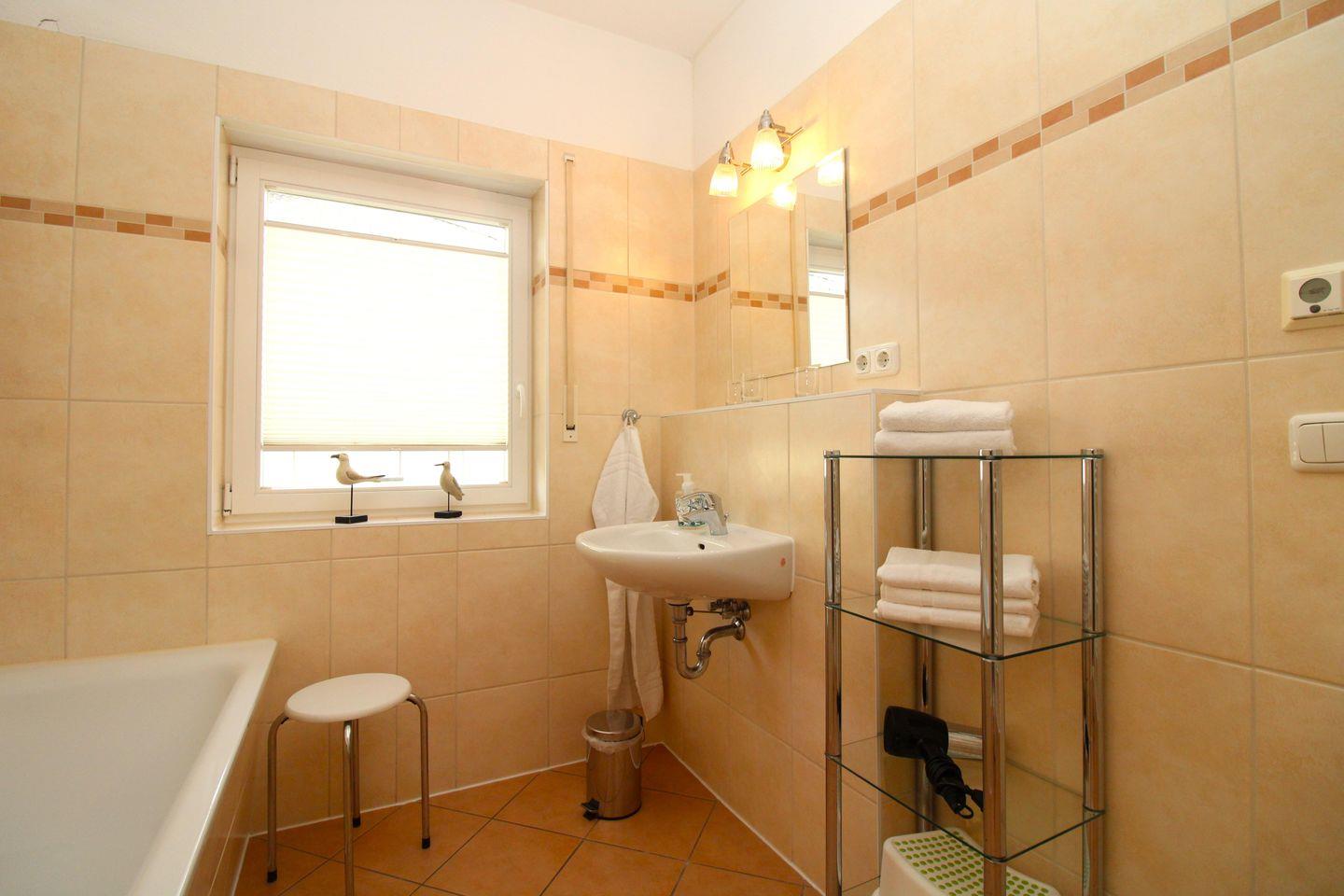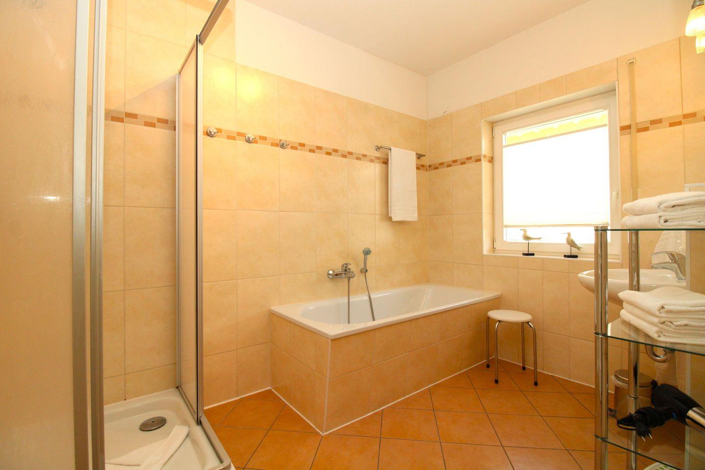 Das große und in warmen Farbtönen gestaltete Badezimmer (mit Tageslicht / Fenster) verfügt über Dusche und Badewanne, ein Waschbecken, einen Hocker sowie ausreichend Ablagemöglichkeiten. Das WC (mit Waschbecken) ist separat.