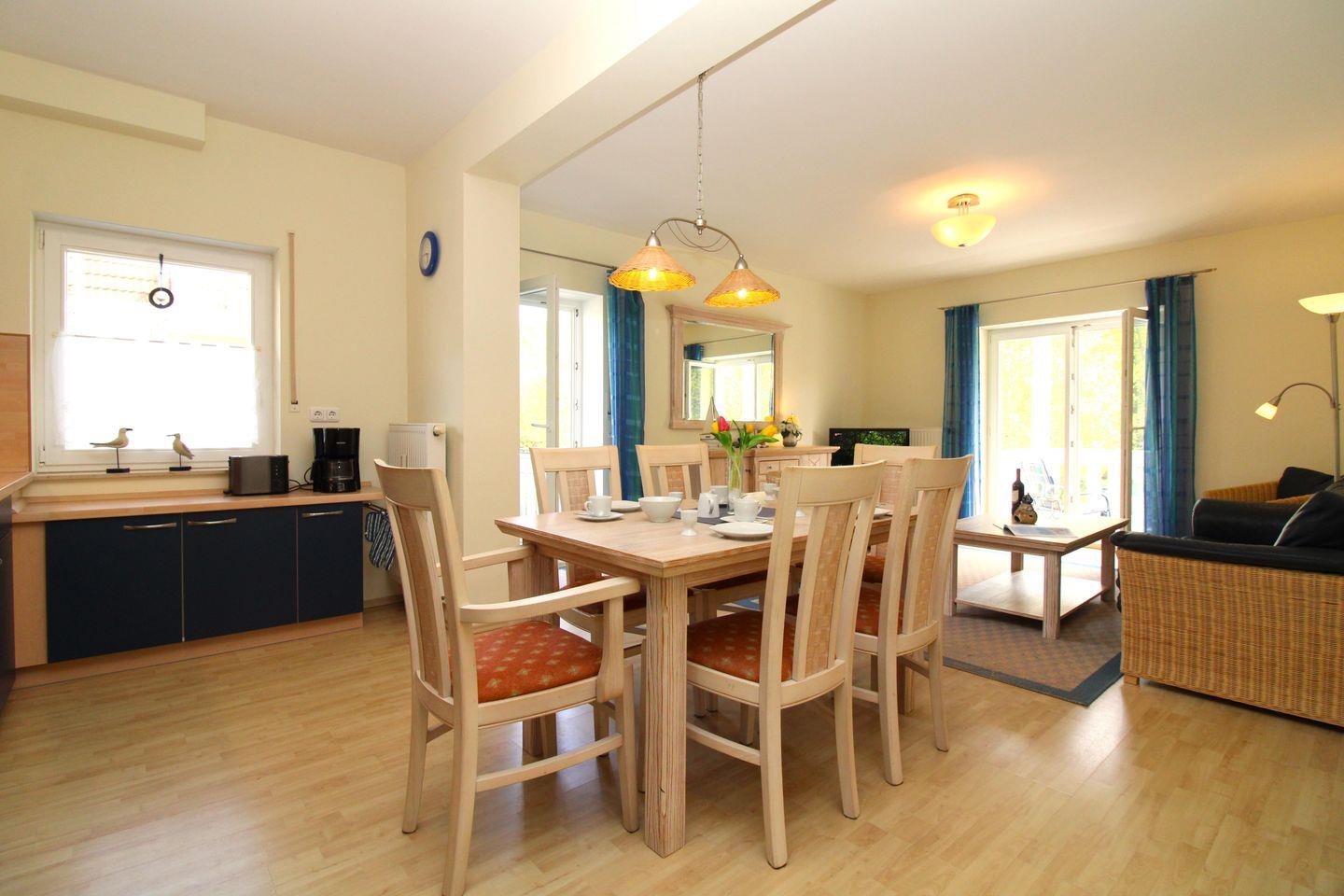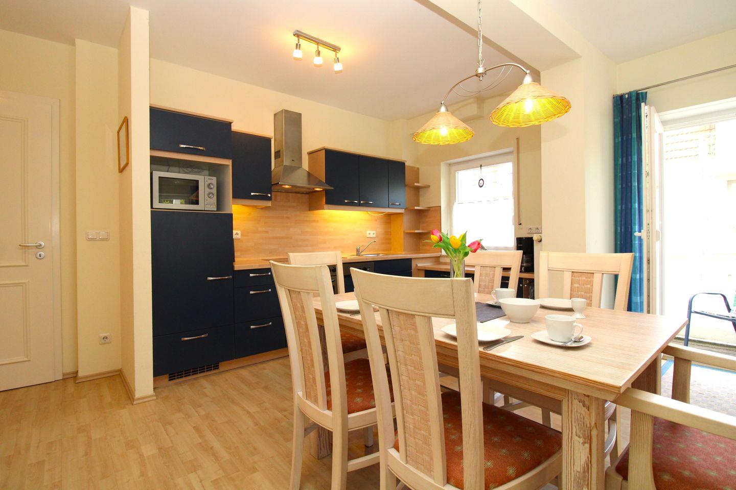 Die offene Küche beinhaltet eine voll ausgestattete Einbauküchenzeile in gehobener Ausstattung mit 4-Zonen-Ceran-Kochfeld, Backofen, Dunstabzug, Mikrowelle, Kühlschrank mit Gefrierfach, Geschirrspülmaschine, Kaffeemaschine, Wasserkocher und Toaster. Die Küche ist mit Geschirr, Gläsern, Besteck und Töpfen bestens und ausreichend ausgestattet.