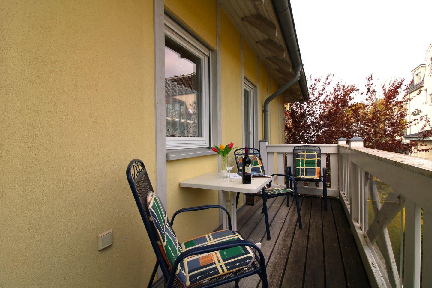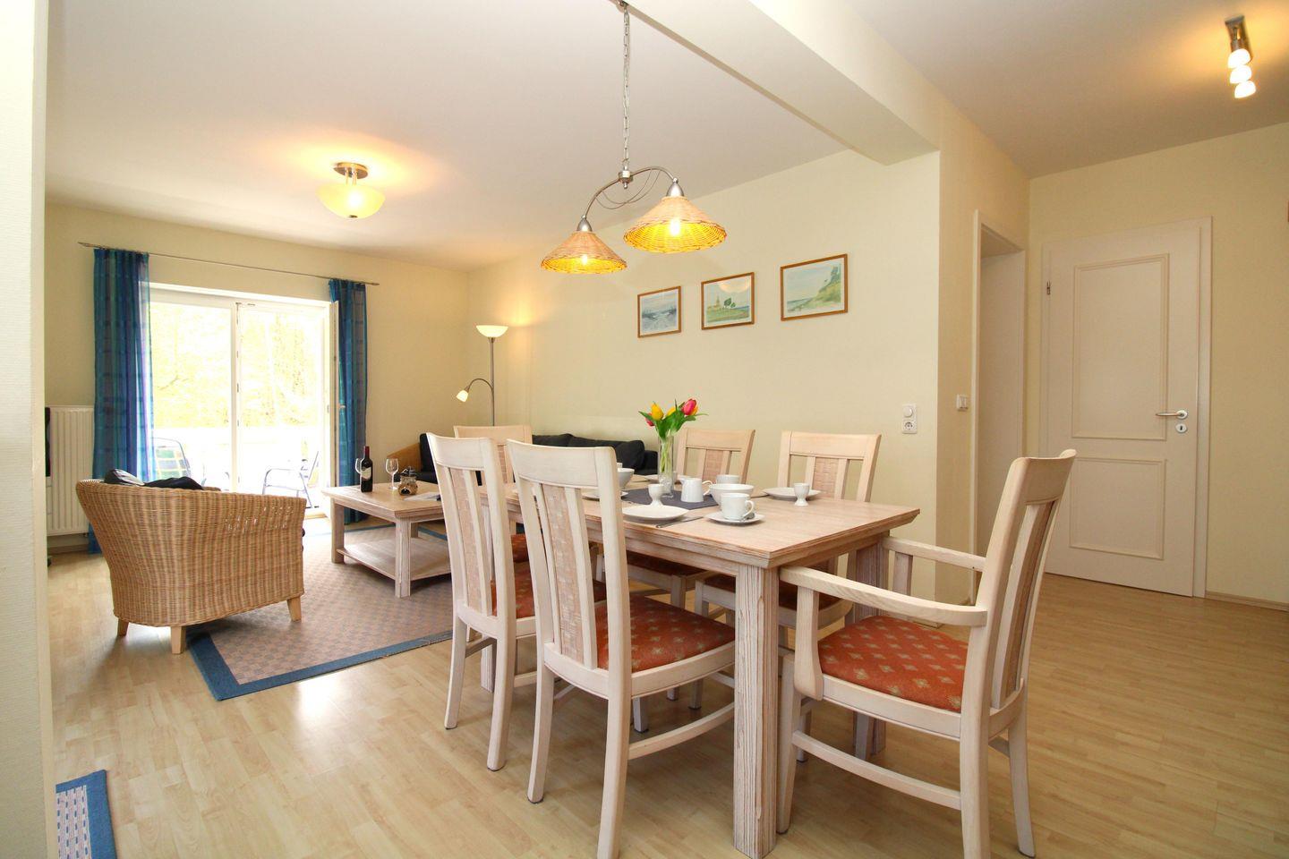 Das freundliche, moderne und hochwertig eingerichtete Wohn-/Esszimmer verfügt über eine separate Sitzgruppe mit bequemer Couch, 2 Sesseln und Couchtisch, einen separaten Esstisch mit 6 Stühlen sowie ein Sideboard. Vom Wohnzimmer aus haben Sie direkten Zugang zu den beiden ca. 7 m² bzw. 5,5 m² großen und sonnigen Balkonen (nach Osten bzw. nach Süden ausgerichtet) mit Balkonmöbeln - hier sitzen Sie entspannt und gemütlich mitten im Grünen!