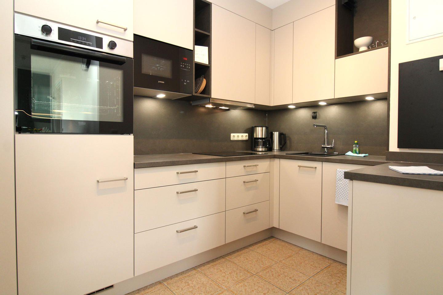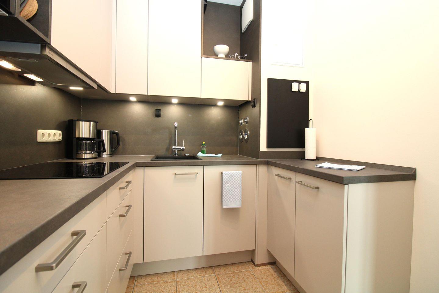 Die halb offene und komplett ausgestattete Küche befindet sich direkt hinter dem Essbereich. Sie verfügt über eine Einbauküchenzeile mit Geschirrspüler, großem Kühlschrank mit Gefrierfach, 4-Zonen-Induktionsherd, Dunstabzug, Backofen mit Heißluft und Grillfunktion, Mikrowelle sowie Kaffeemaschine, Wasserkocher und Toaster. Die Küche ist mit Geschirr, Gläsern, Besteck und Töpfen bestens und ausreichend ausgestattet.