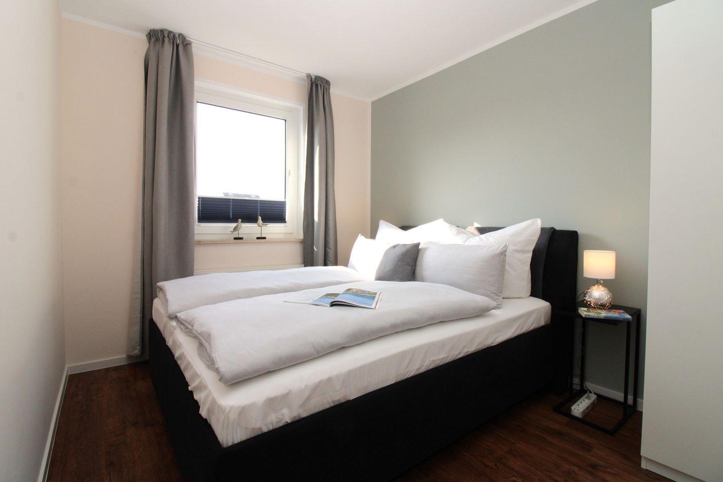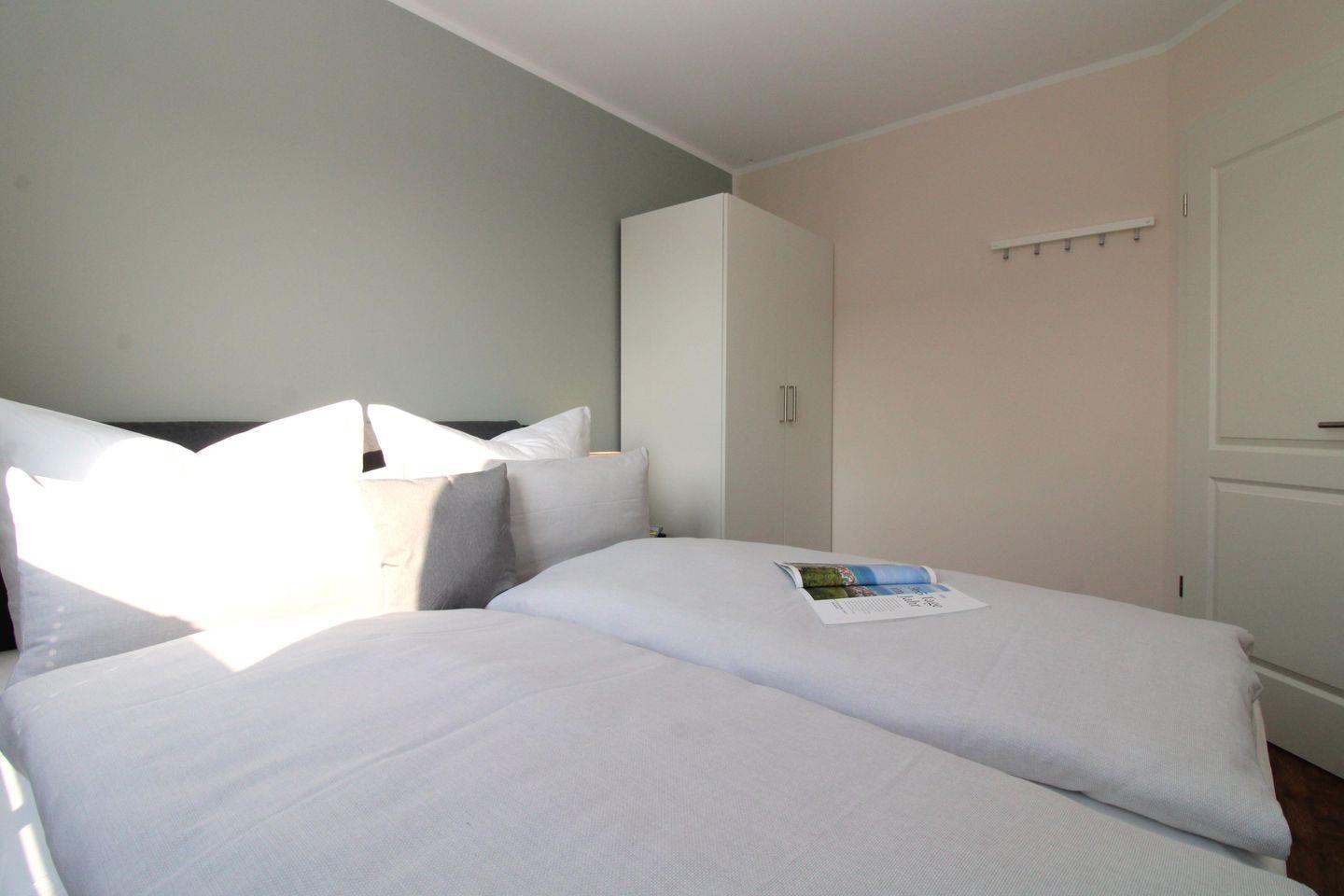 Das separate und moderne Schlafzimmer ist mit einem bequemen Polster-Doppelbett (2 x 80 x 200), Nachttischen, einem geräumigen Kleiderschrank sowie einer Garderobenleiste eingerichtet. Eine zusätzliche bequeme Schlafmöglichkeit für eine weitere 3. Person bietet die ausziehbare Schlafcouch (140 x 200) im Wohnzimmer.