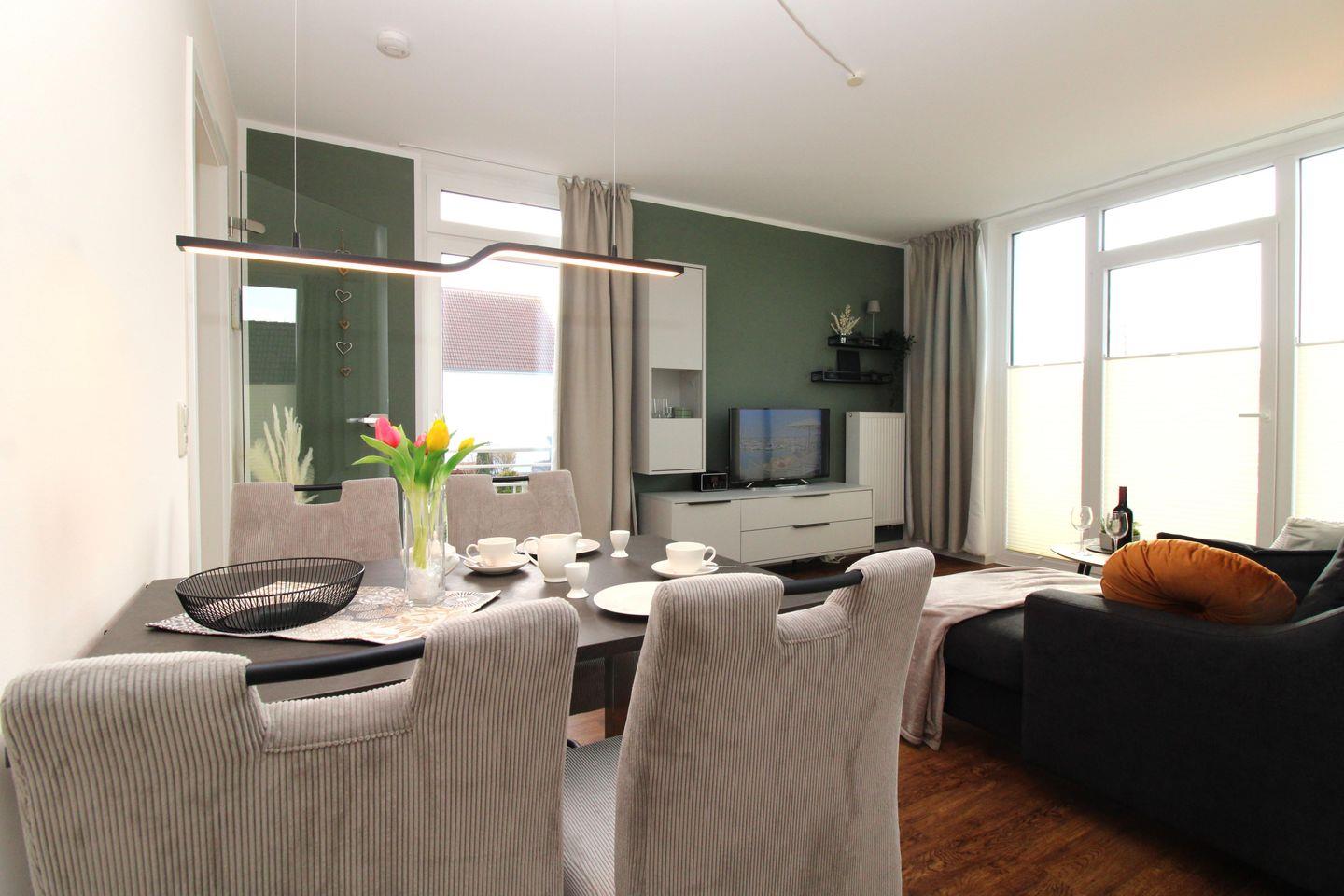 Unmittelbar an den Wohnbereich grenzt der separate Essbereich mit Esstisch und 4 bequemen Stühlen.