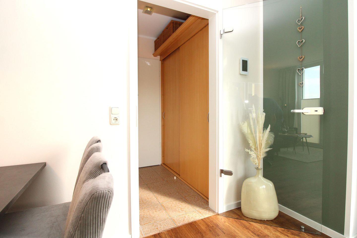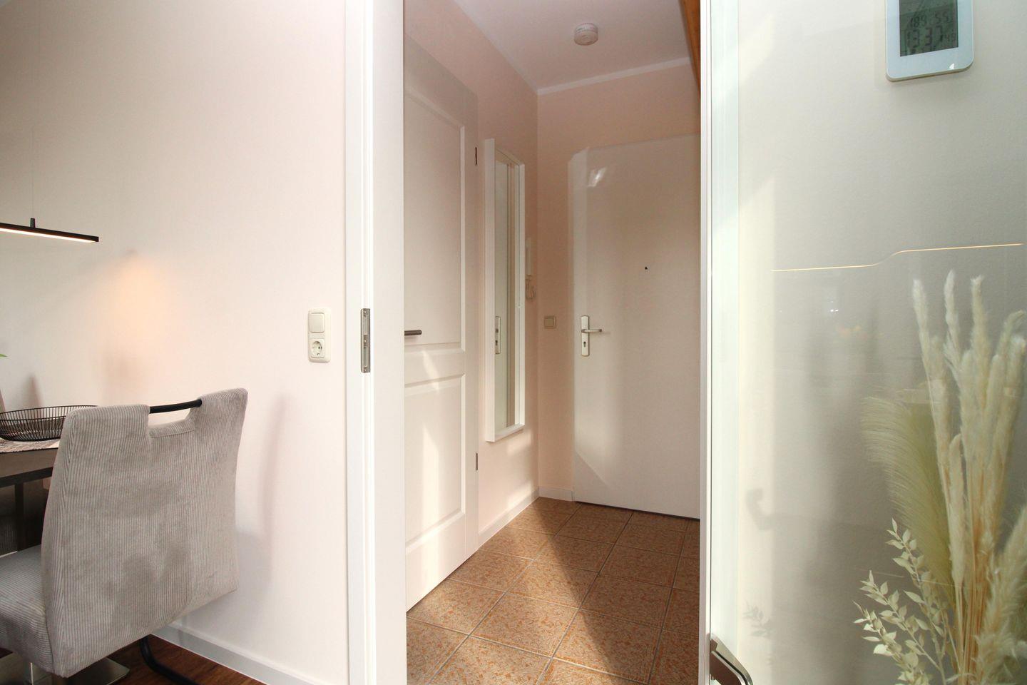 Die lichtdurchflutete, freundliche, sehr gut und geschmackvoll eingerichtete 2-Zimmer-Wohnung (ca. 43 m²) befindet sich im 1. Obergeschoss. Die im Frühjahr 2024 komplett renovierte und neu möblierte Wohnung besitzt ein hohes Maß an Wohlfühlkomfort und ist komplett ausgestattet. Der Bodenbelag in den Wohnräumen ist moderner Vinyl-Designbelag, der Eingangsbereich sowie die Küche und das Bad / WC sind gefliest.