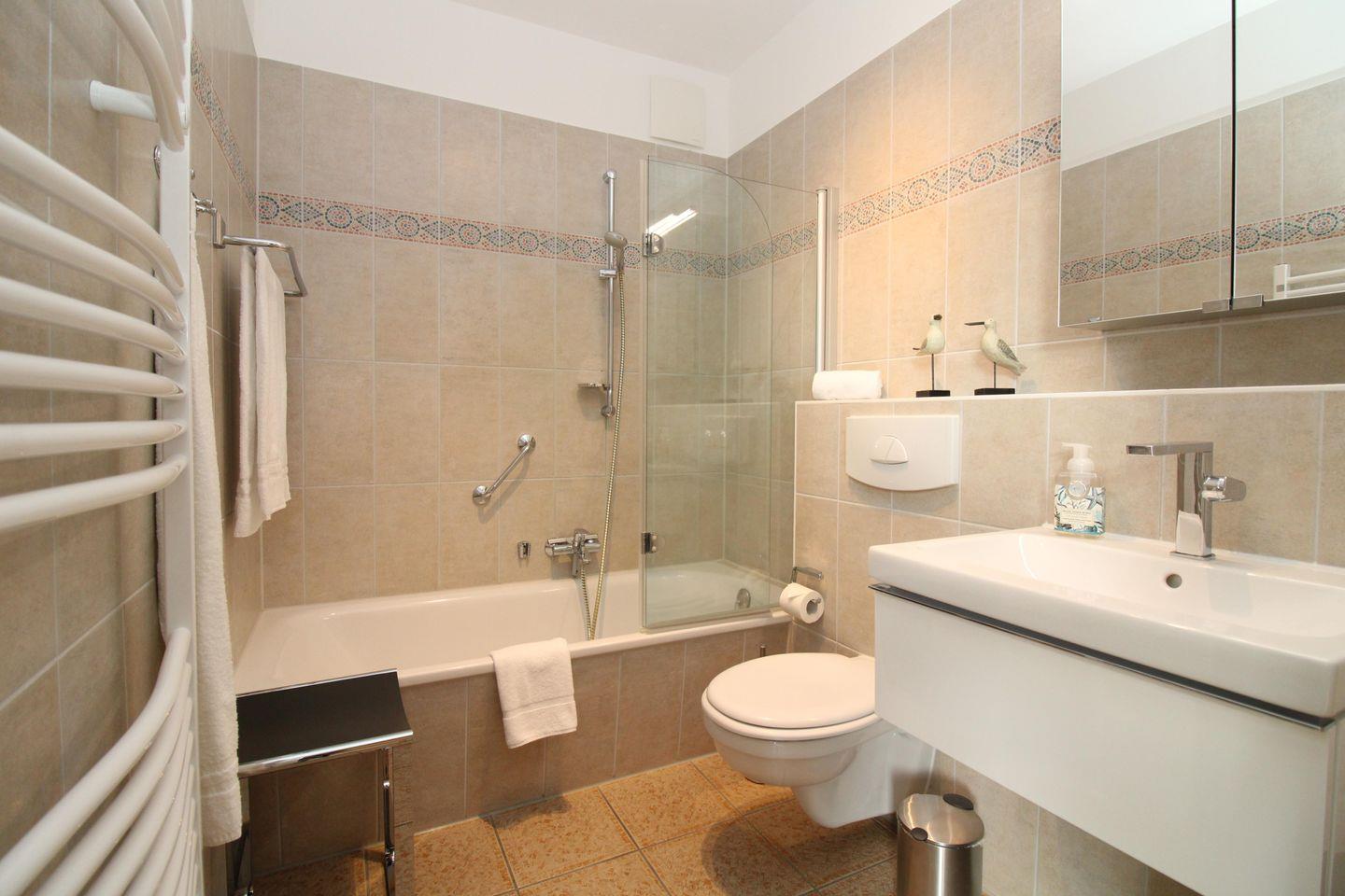 Das freundliche und geräumige Badezimmer verfügt über eine Badewanne mit Echtglas-Duschtrennwand, WC, Waschbecken mit Unter- und Spiegelschrank, Handtuch-Heizkörper sowie ausreichend Ablageflächen.