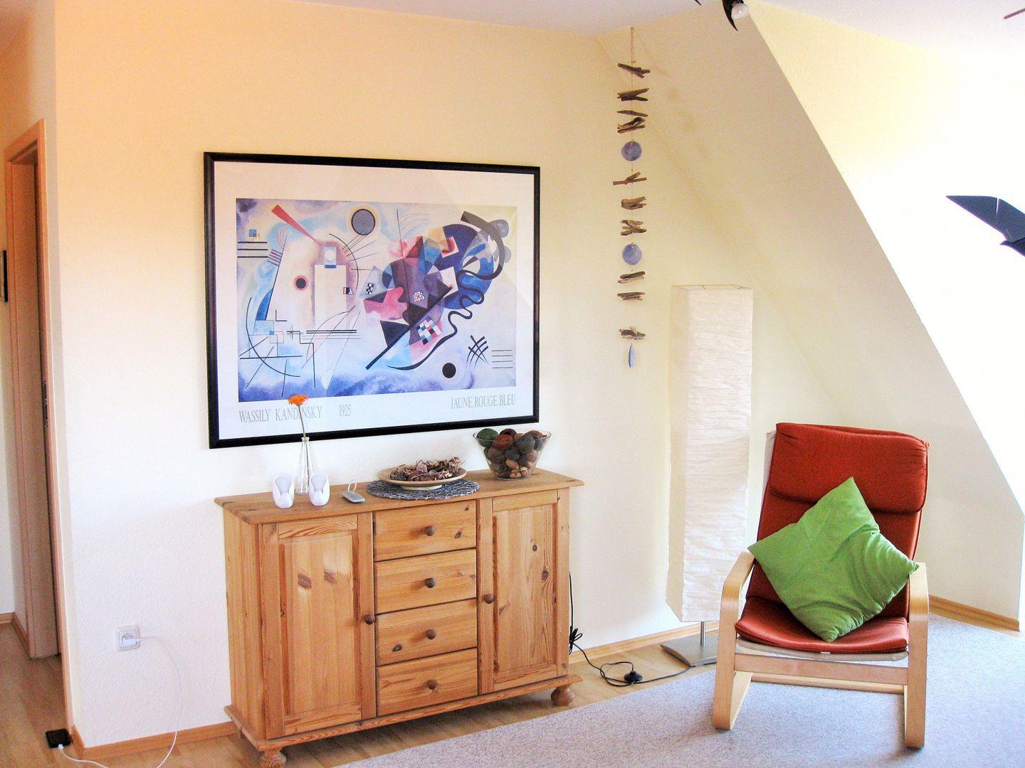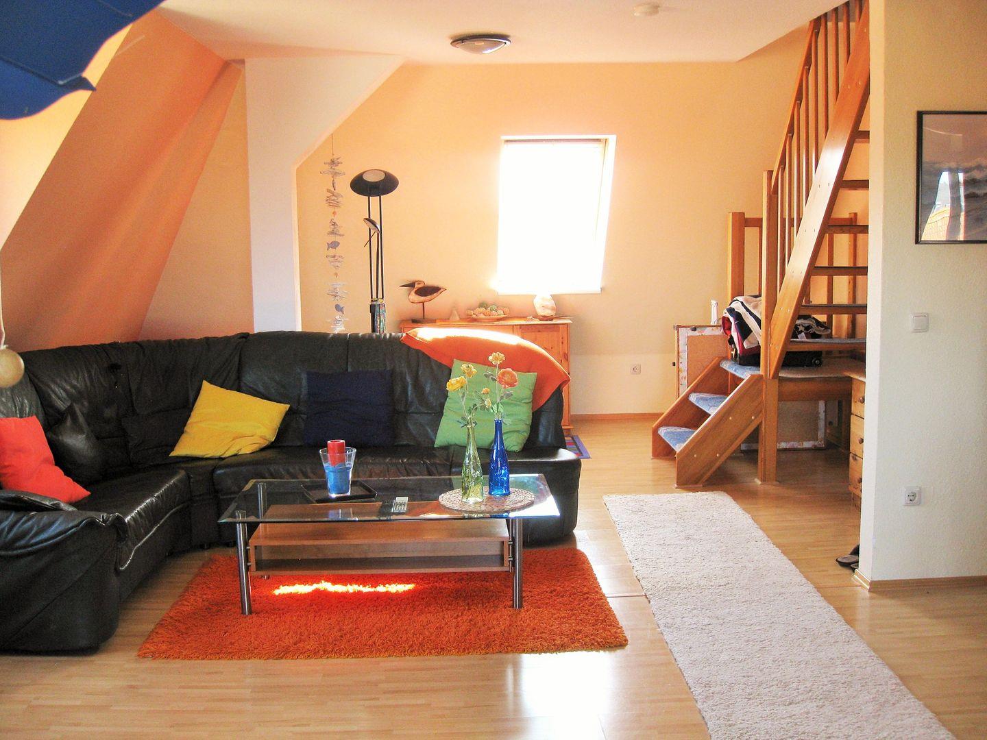 Das helle, freundliche und geräumige Wohnzimmer verfügt über eine bequeme Ledercouch und Sessel mit Couchtisch. Zu Ihrer Unterhaltung stehen Ihnen hier ein Flachbildschirm-TV-Gerät (Kabel-TV), ein DVD-Player sowie eine Stereo-Anlage zur Verfügung. WLAN ist in der Fewo ebenfalls kostenfrei vorhanden.
