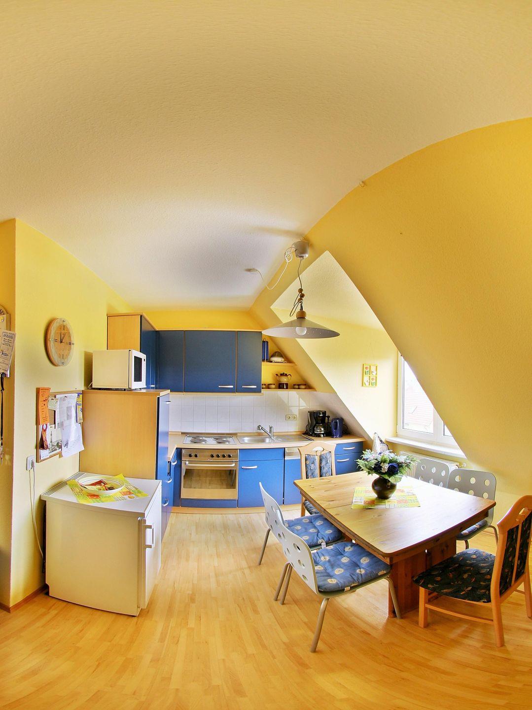 Die separate Küche beinhaltet eine voll ausgestattete Einbauküchenzeile mit 4-Platten-Herd, Backofen, Kühlschrank mit Gefrierfach, Geschirrspülmaschine, Mikrowelle, Kaffee-maschine, Wasserkocher und Toaster. Darüber hinaus verfügt die Küche über einen Esstisch mit 6 Stühlen sowie ausreichend Ablagemöglichkeiten. Die Küche ist mit Geschirr, Gläsern, Besteck und Töpfen gut und ausreichend ausgestattet.