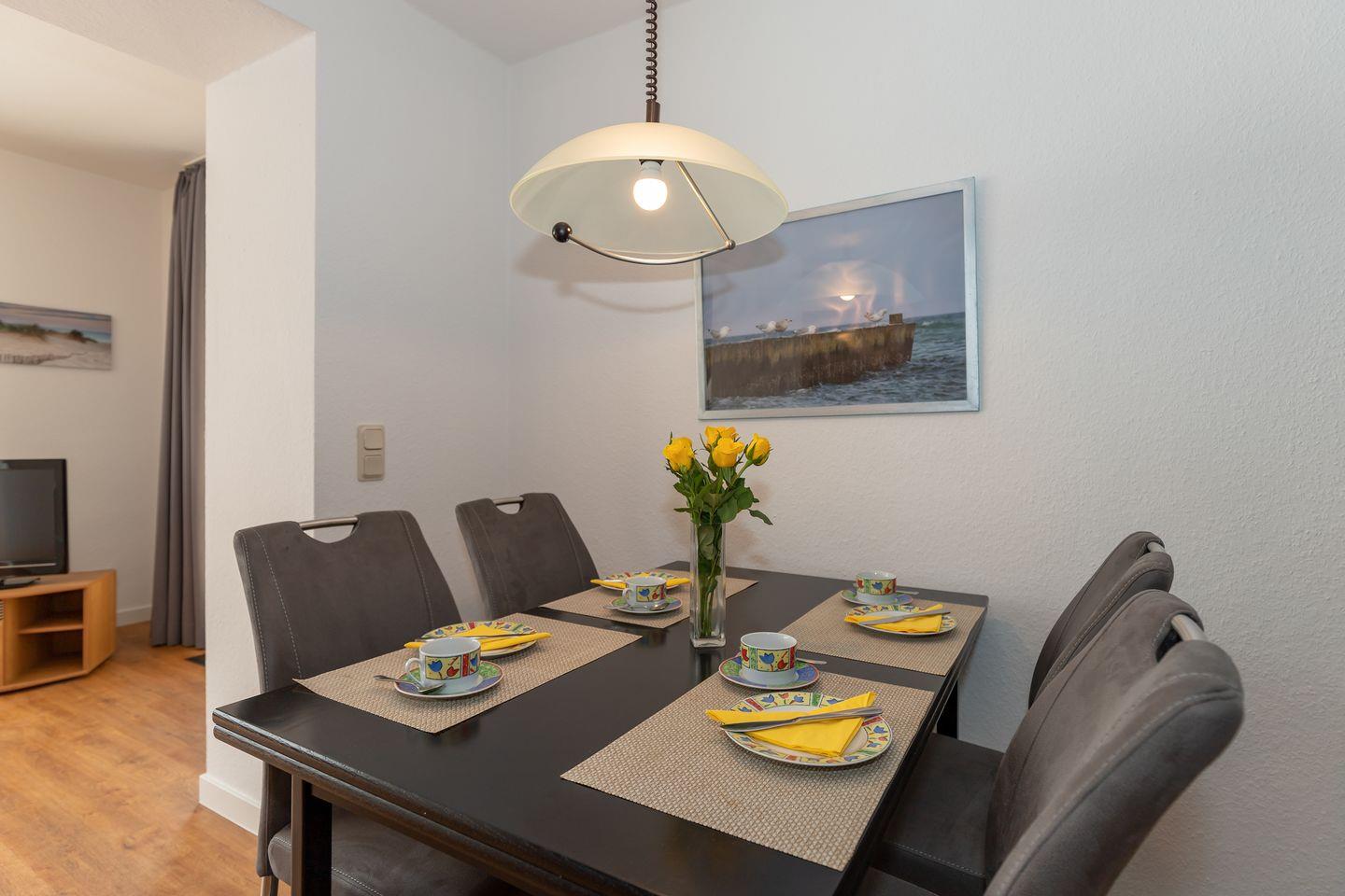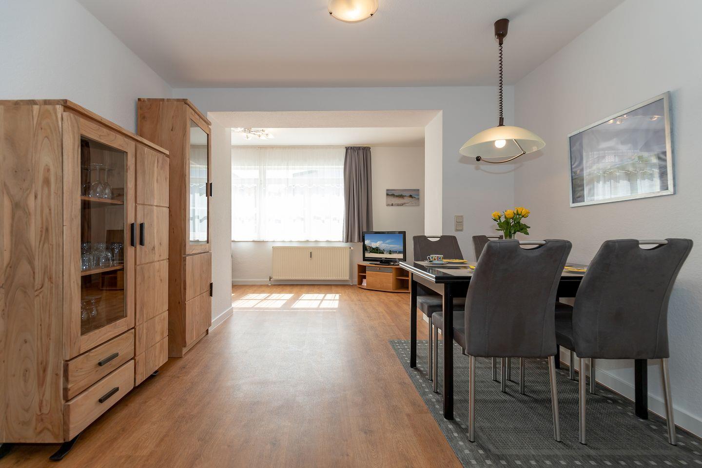 Das geräumige Wohn-/Esszimmer ist mit einer separaten Sitzgruppe mit einer bequemen (und ausziehbaren Schlaf-) Couch, Couchtisch und 2 Sesseln, einem separaten Esstisch mit 4 Stühlen sowie 2 Schränken eingerichtet.