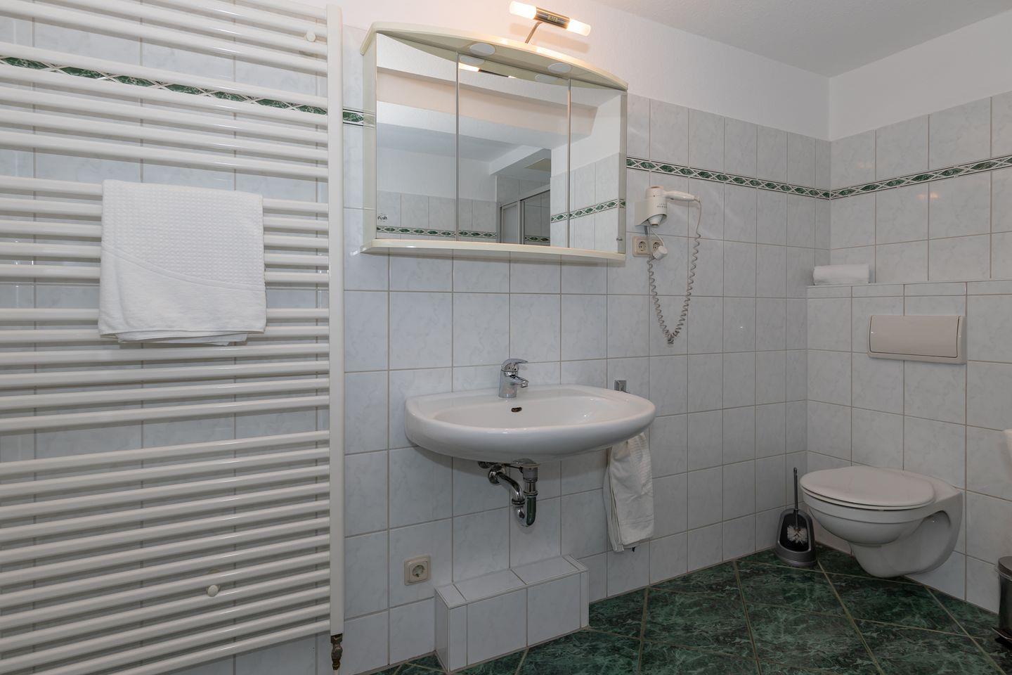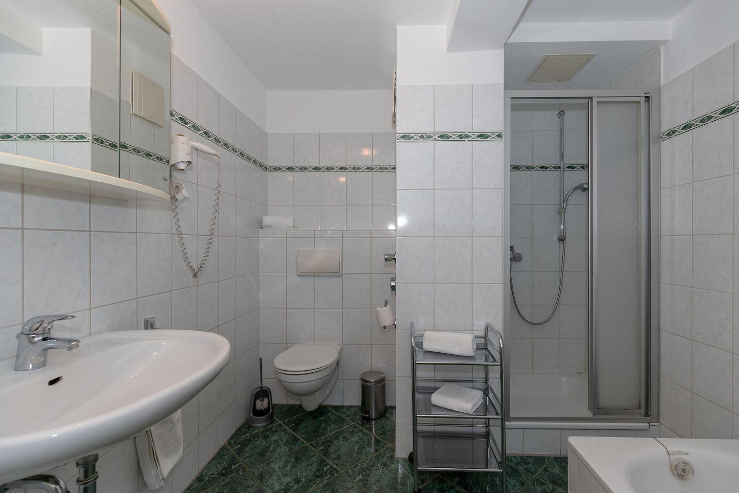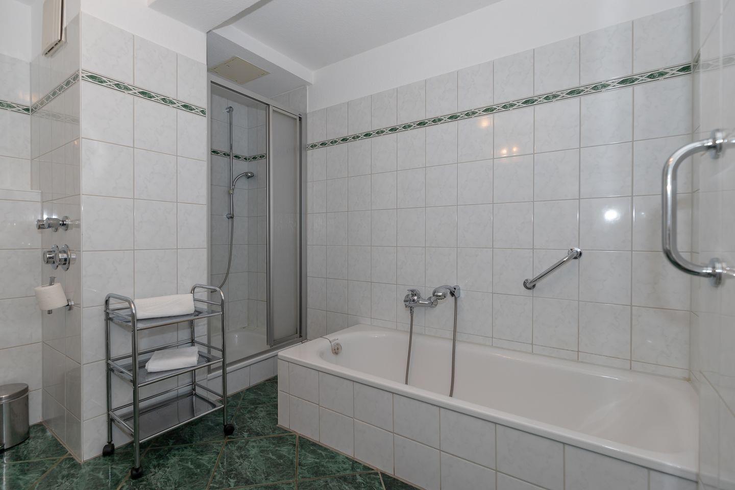 Das große und moderne Badezimmer verfügt über Dusche und Badewanne, Waschbecken mit Spiegelschrank, WC, Handtuch-Heizkörper sowie ausreichend Ablagemöglichkeiten.