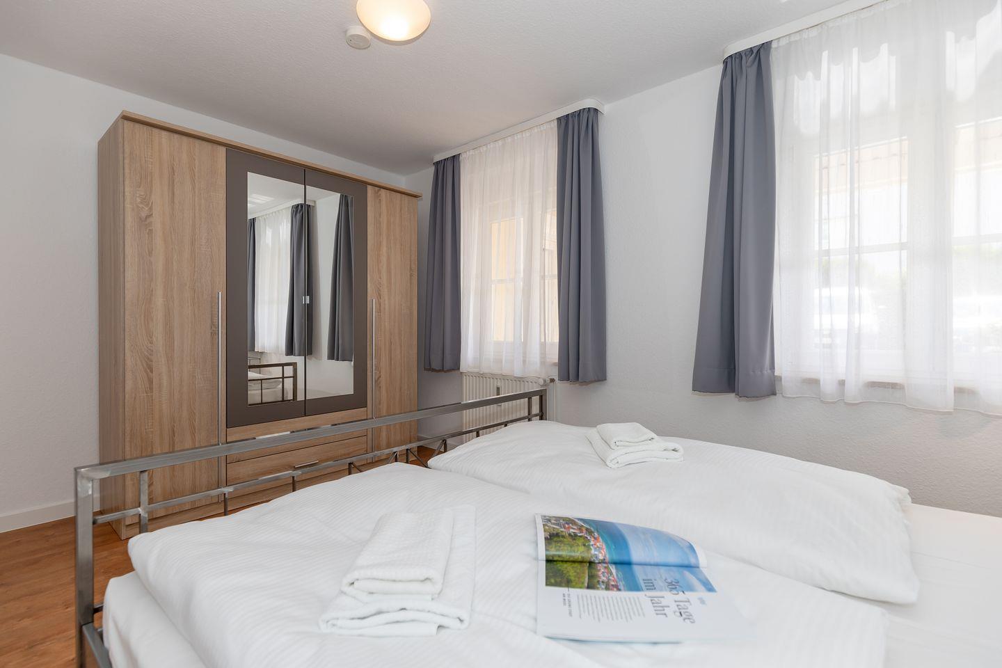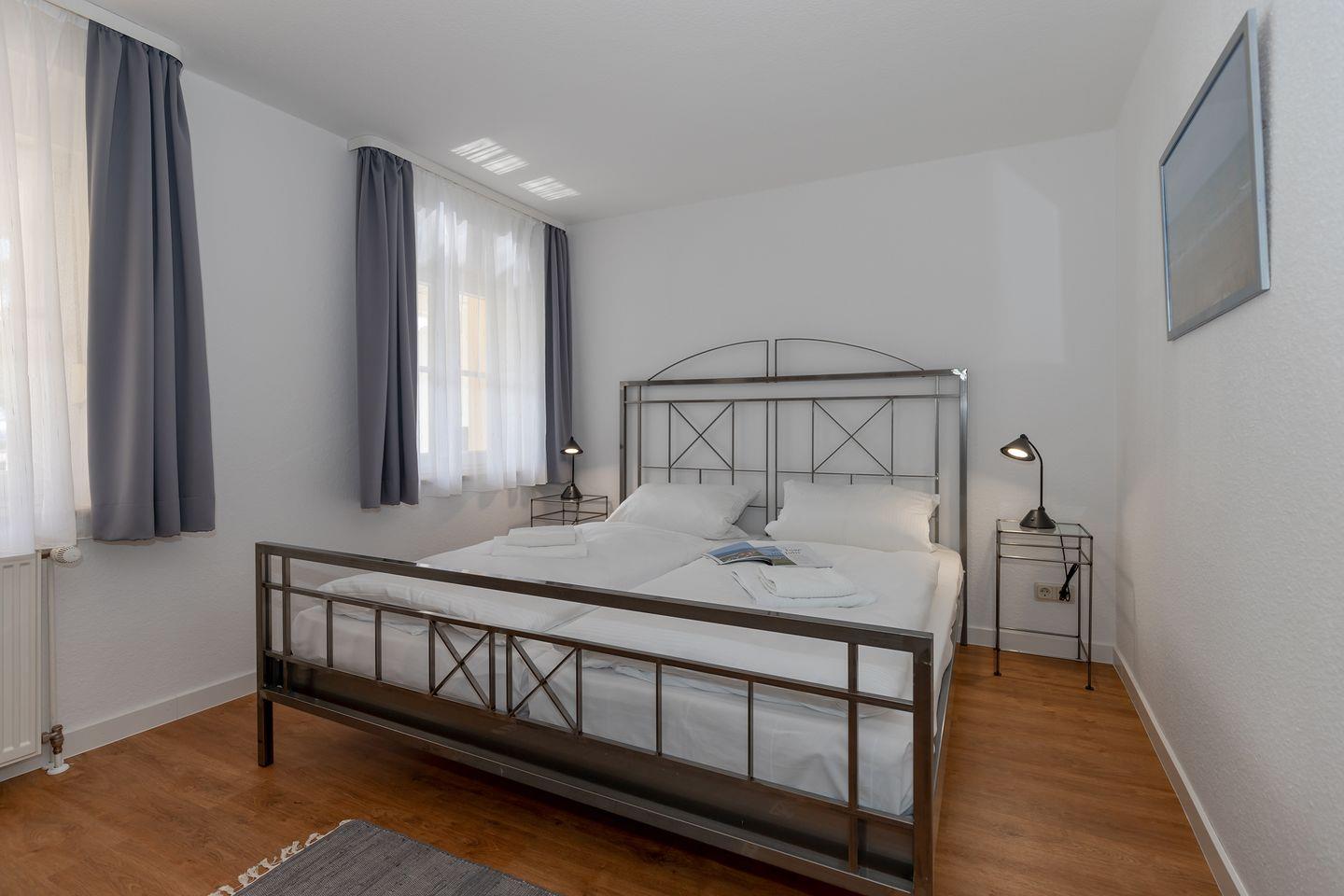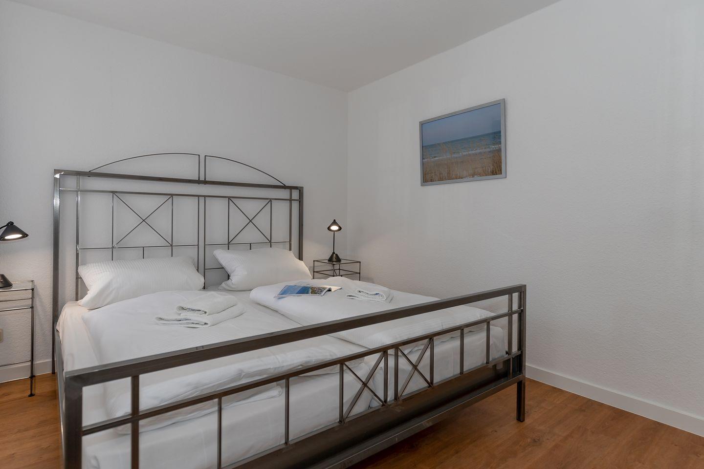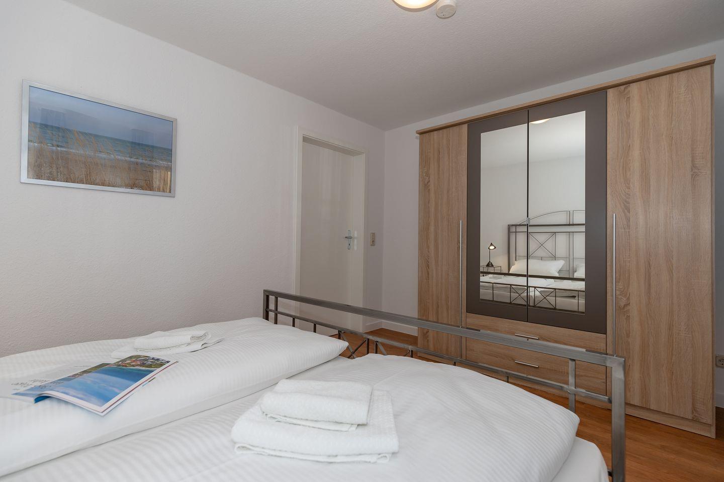 Das freundliche Schlafzimmer ist mit einem bequemen Doppelbett, Nachttischen sowie einem geräumigen Kleiderschrank eingerichtet. Eine zusätzliche bequeme Schlafmöglichkeit für eine weitere 3. bzw. 4. Person bietet die ausziehbare Schlafcouch im Wohnzimmer.