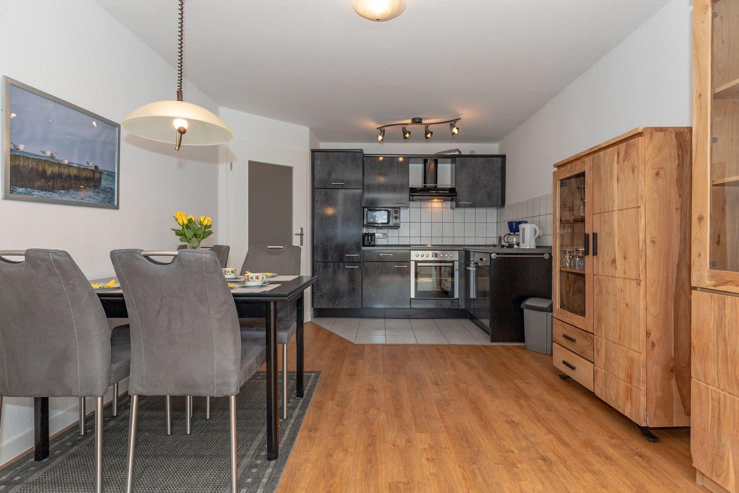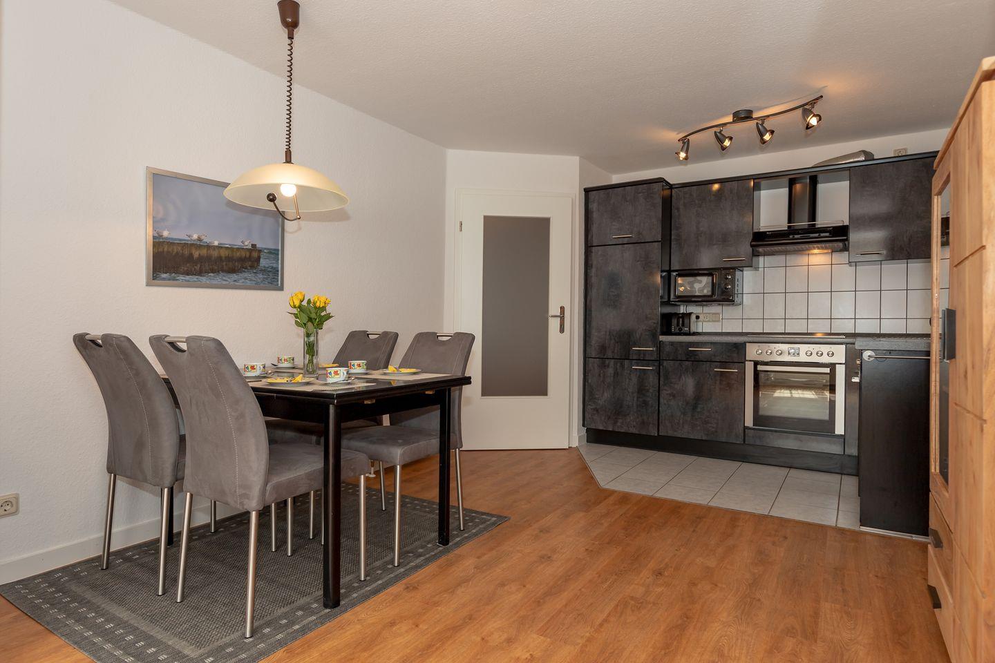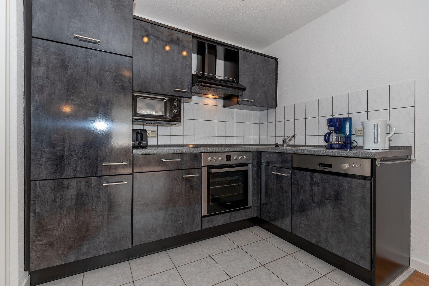 Der an den Essbereich angrenzende offene Küchenbereich beinhaltet eine komplett aus-gestattete Einbauküchenzeile mit 4-Zonen-Ceran-Kochfeld, Dunstabzug, Backofen, Mikrowelle, Kühlschrank mit Gefrierfach, Geschirrspülmaschine, Kaffeemaschine, Wasserkocher und Toaster. Die Küche ist mit Geschirr, Gläsern, Besteck und Töpfen bestens und vollständig ausgestattet.