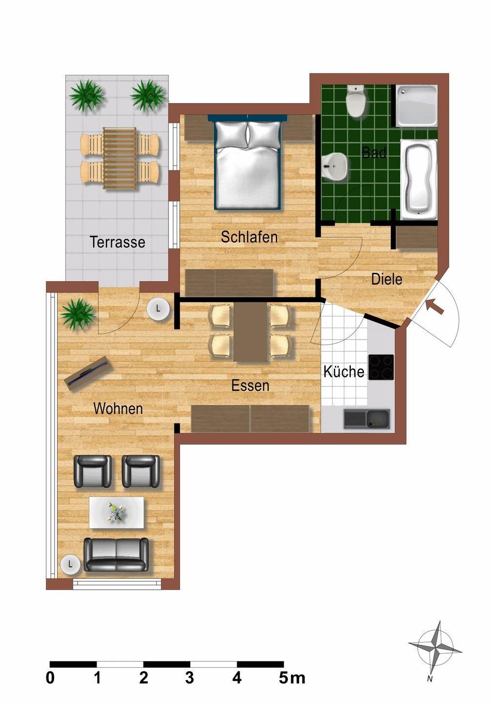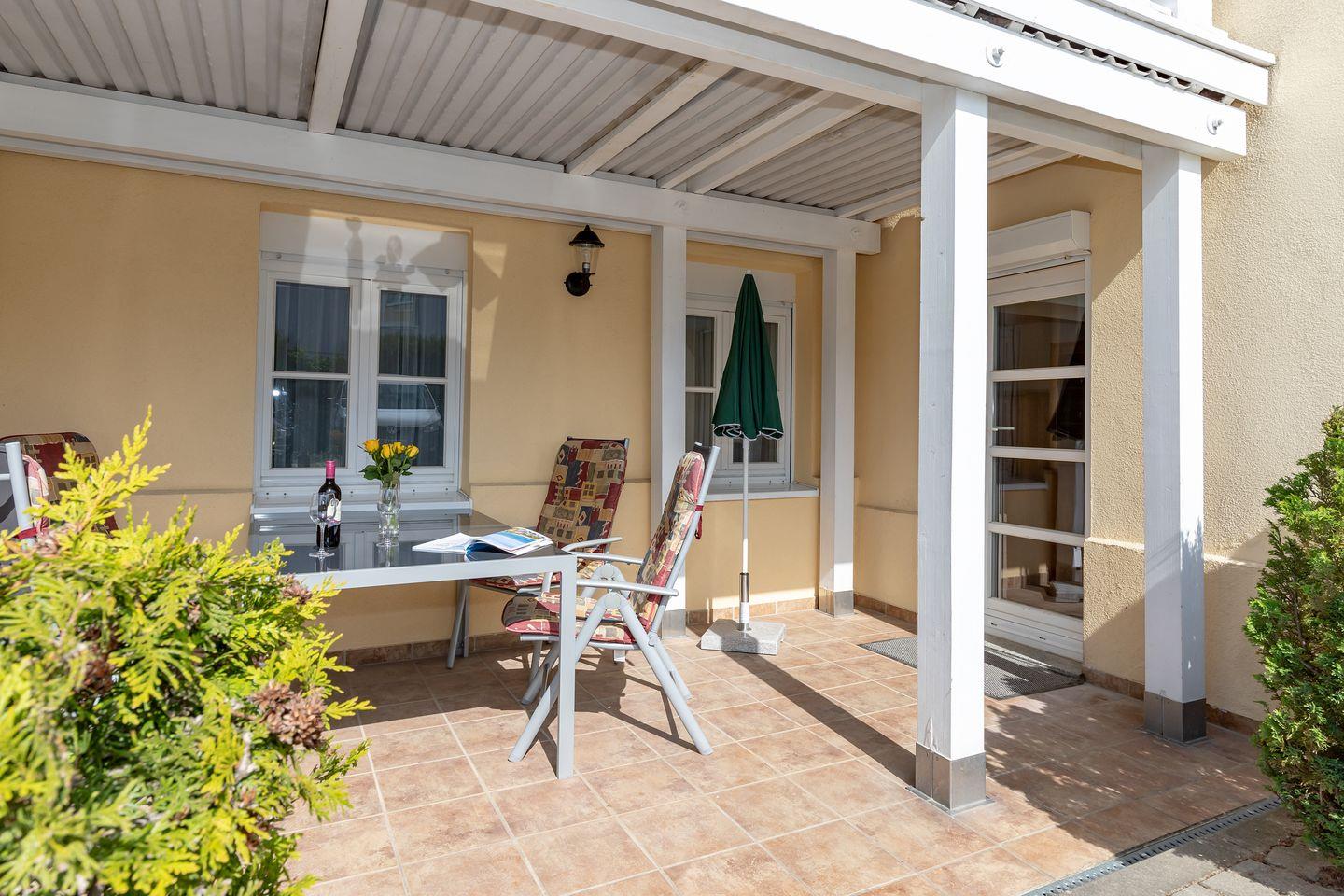 Die Wohnung verfügt über eine ebenerdige nach Osten (Morgensonne!) ausgerichtete große und überdachte Terrasse (ca. 10 m²), die Sie vom Wohnzimmer aus erreichen. Hier sitzen Sie entspannt und können bei einer guten Flasche Wein die lauen Sommernächte genießen!