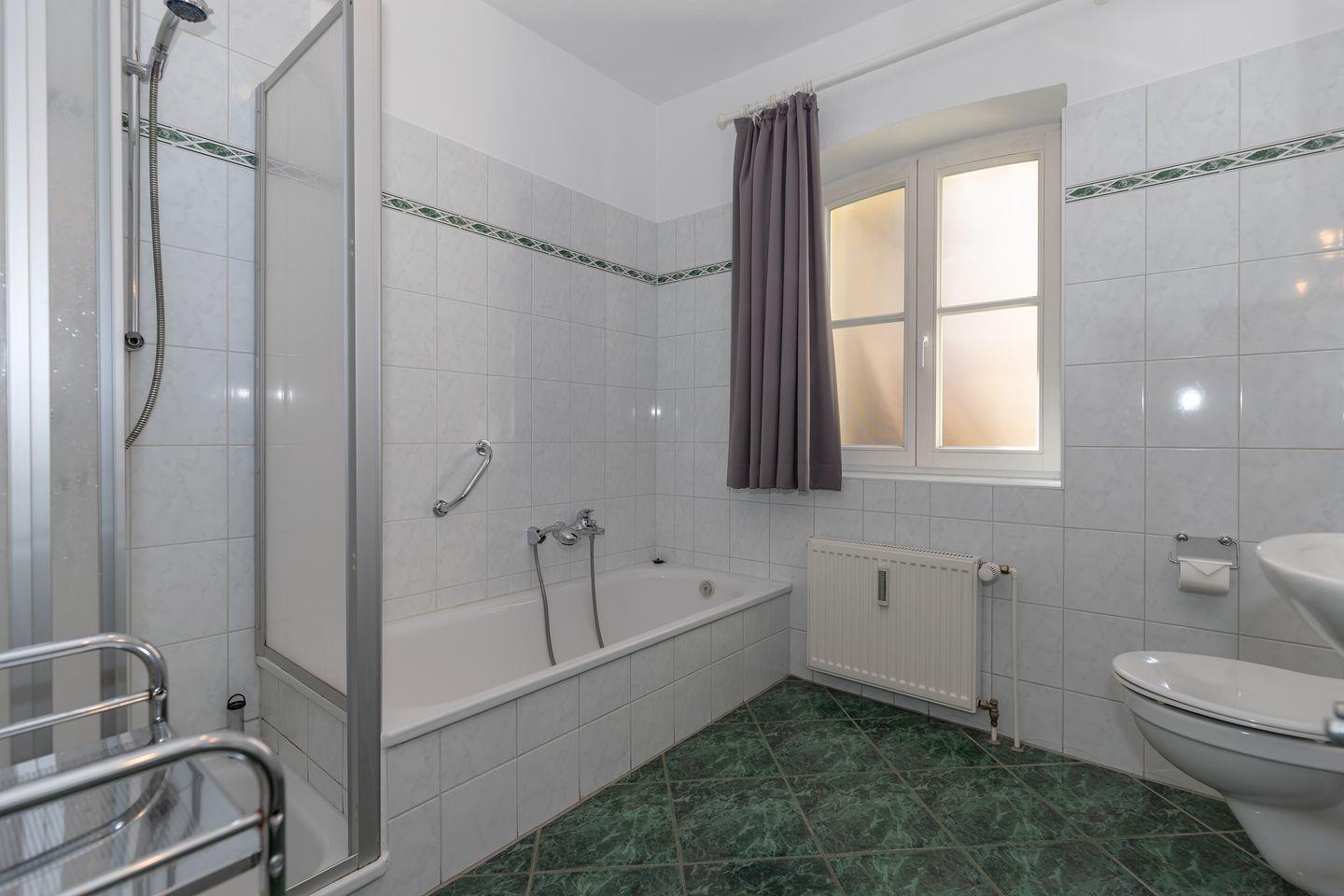 Das große und moderne Badezimmer (mit Fenster / Tageslicht!) verfügt über Dusche und Badewanne, 2 Waschbecken, WC, Handtuch-Heizkörper sowie ausreichend Ablage-möglichkeiten. Darüber hinaus hat die Wohnung eine zusätzliche Gästetoilette.
