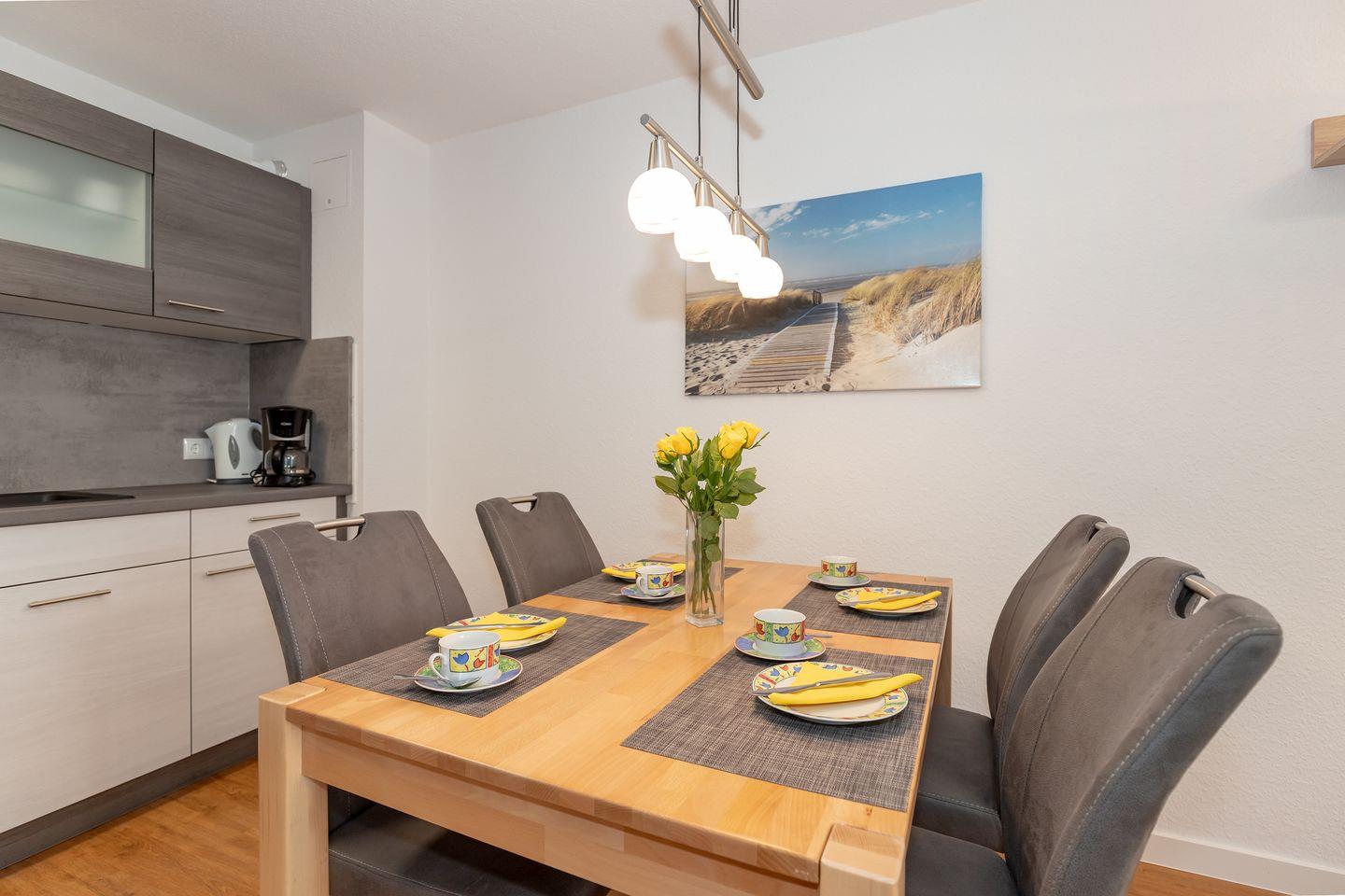 Der an den Essbereich angrenzende offene Küchenbereich beinhaltet eine moderne und komplett ausgestattete Einbauküchenzeile mit 4-Zonen-Ceran-Kochfeld, Dunstabzug, Backofen, Mikrowelle, Kühlschrank mit Gefrierfach, Geschirrspülmaschine, Kaffeemaschine, Wasserkocher und Toaster. Die Küche ist mit Geschirr, Gläsern, Besteck und Töpfen bestens und vollständig ausgestattet.
