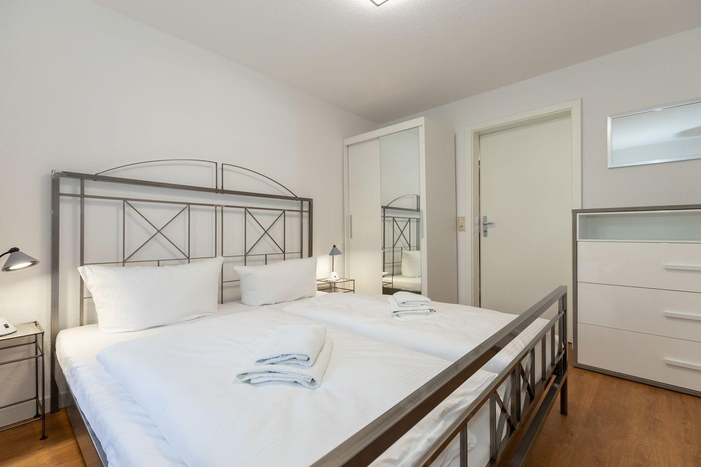 Das freundliche Schlafzimmer ist mit einem bequemen Doppelbett, Nachttischen, einem Kleiderschrank sowie einer großen Kommode eingerichtet.