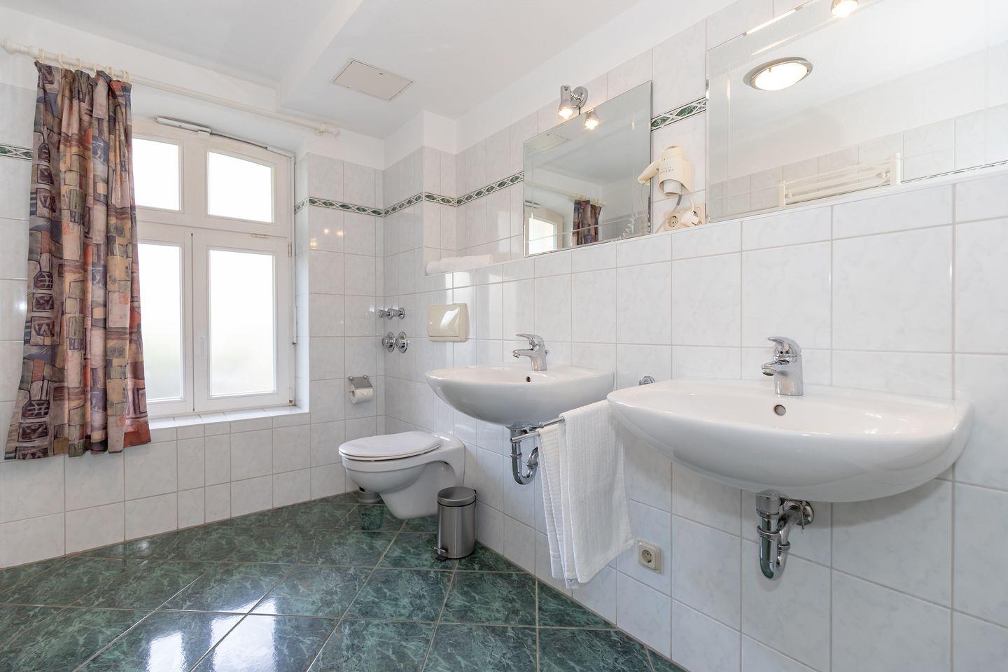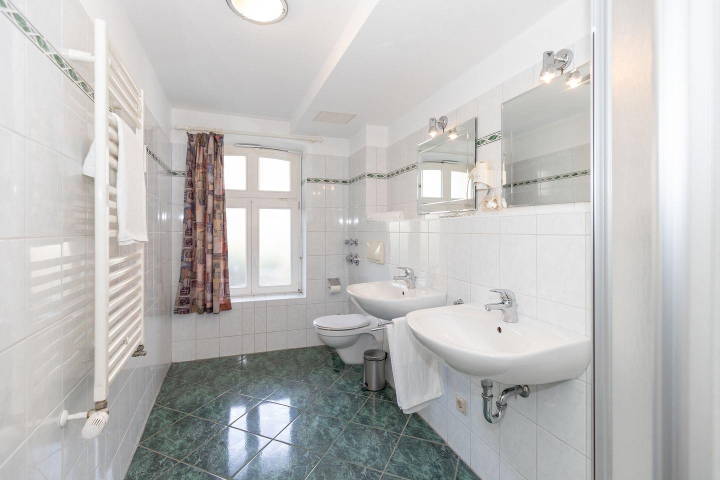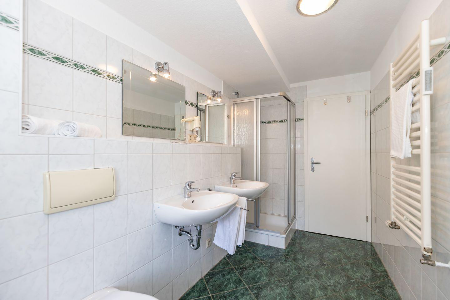 Das große und moderne Badezimmer (mit Fenster / Tageslicht!) verfügt über eine Dusche, 2 Waschbecken, WC, Handtuch-Heizkörper sowie ausreichend Ablagemöglichkeiten.