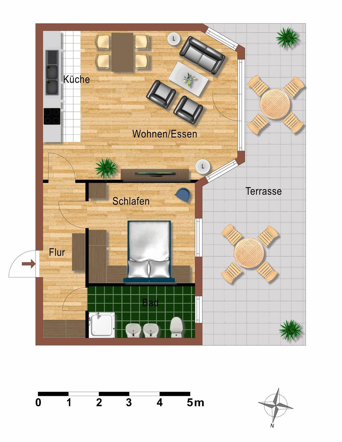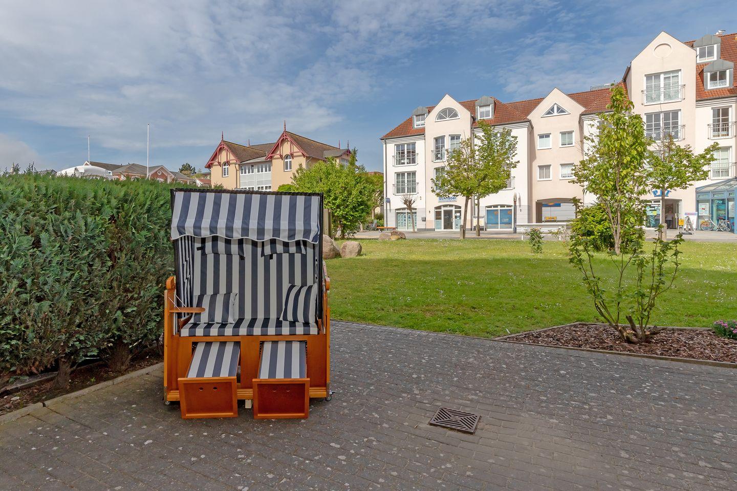 Die Wohnung verfügt über eine ebenerdige - nach Westen (Abendsonne!) ausgerichtete - große und teilweise überdachte Terrasse (ca. 30 m²), die Sie vom Wohnzimmer aus erreichen und wo Ihnen ein große Terrassensitzgruppe sowie ein Strandkorb zur Verfügung stehen. Hier sitzen Sie entspannt und können bei einer guten Flasche Wein die lauen Sommernächte genießen!