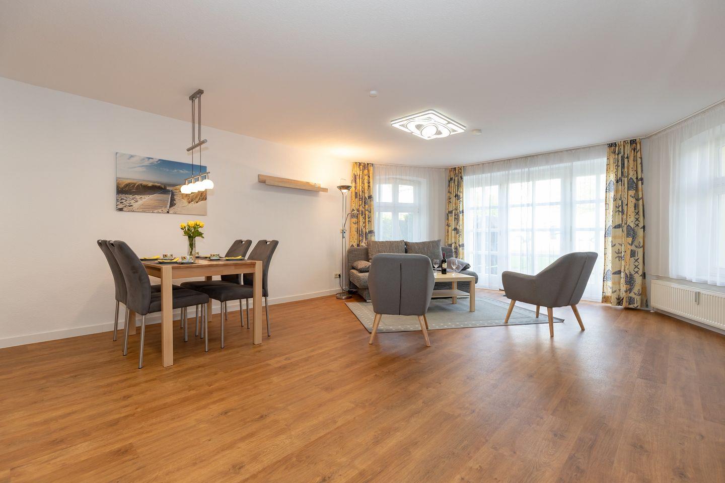Das geräumige Wohn-/Esszimmer ist mit einer separaten Sitzgruppe mit einer bequemen (und ausziehbaren Schlaf-) Couch, Couchtisch und 2 Sesseln, einem separaten Esstisch mit 4 Stühlen sowie einer modernen Schrankwand eingerichtet.