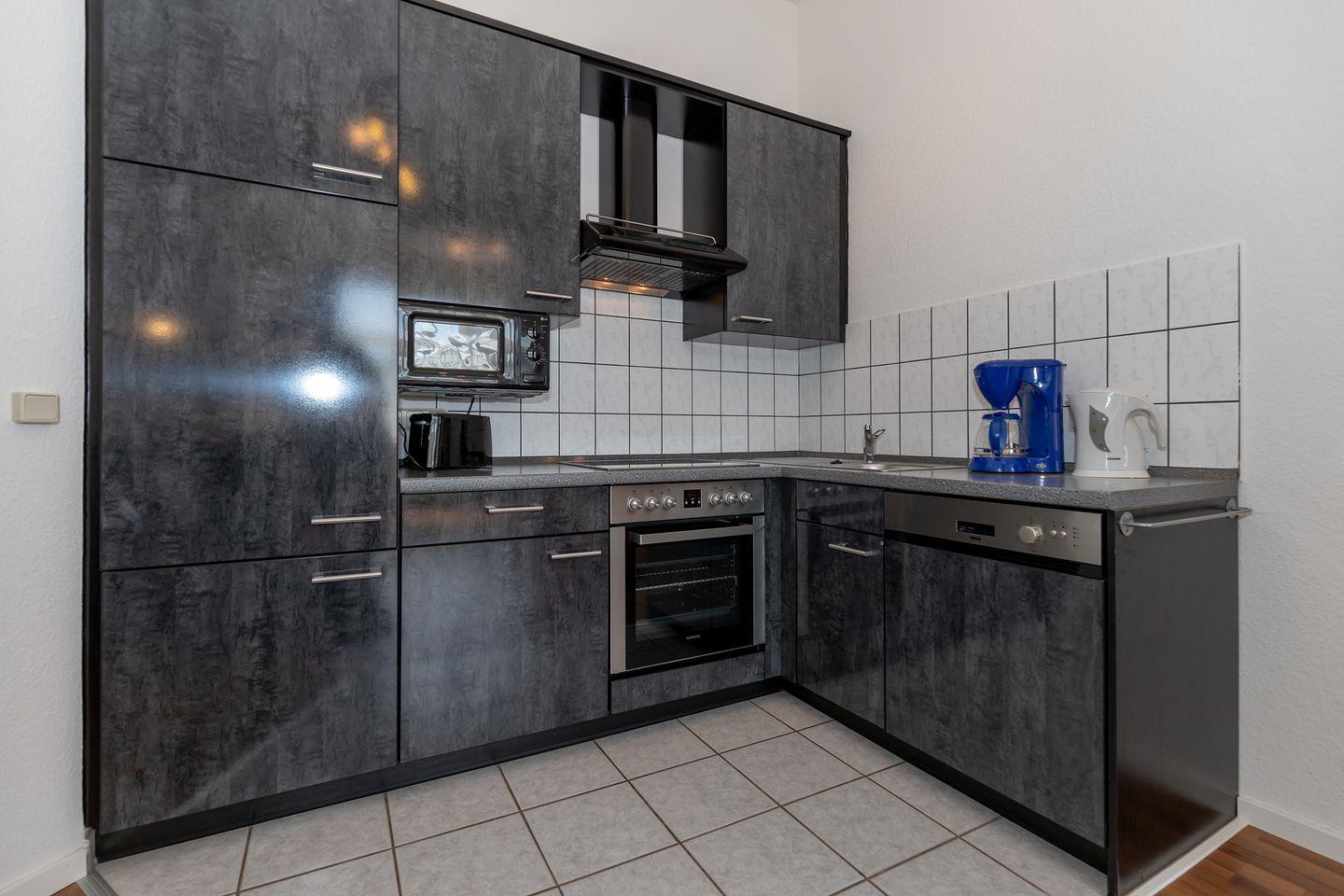 Der an den Essbereich angrenzende offene Küchenbereich beinhaltet eine komplett aus-gestattete Einbauküchenzeile mit 4-Zonen-Ceran-Kochfeld, Dunstabzug, Backofen und Mikrowelle, Kühlschrank mit Gefrierfach, Geschirrspülmaschine, Kaffeemaschine, Wasserkocher und Toaster. Die Küche ist mit Geschirr, Gläsern, Besteck und Töpfen bestens und vollständig ausgestattet.