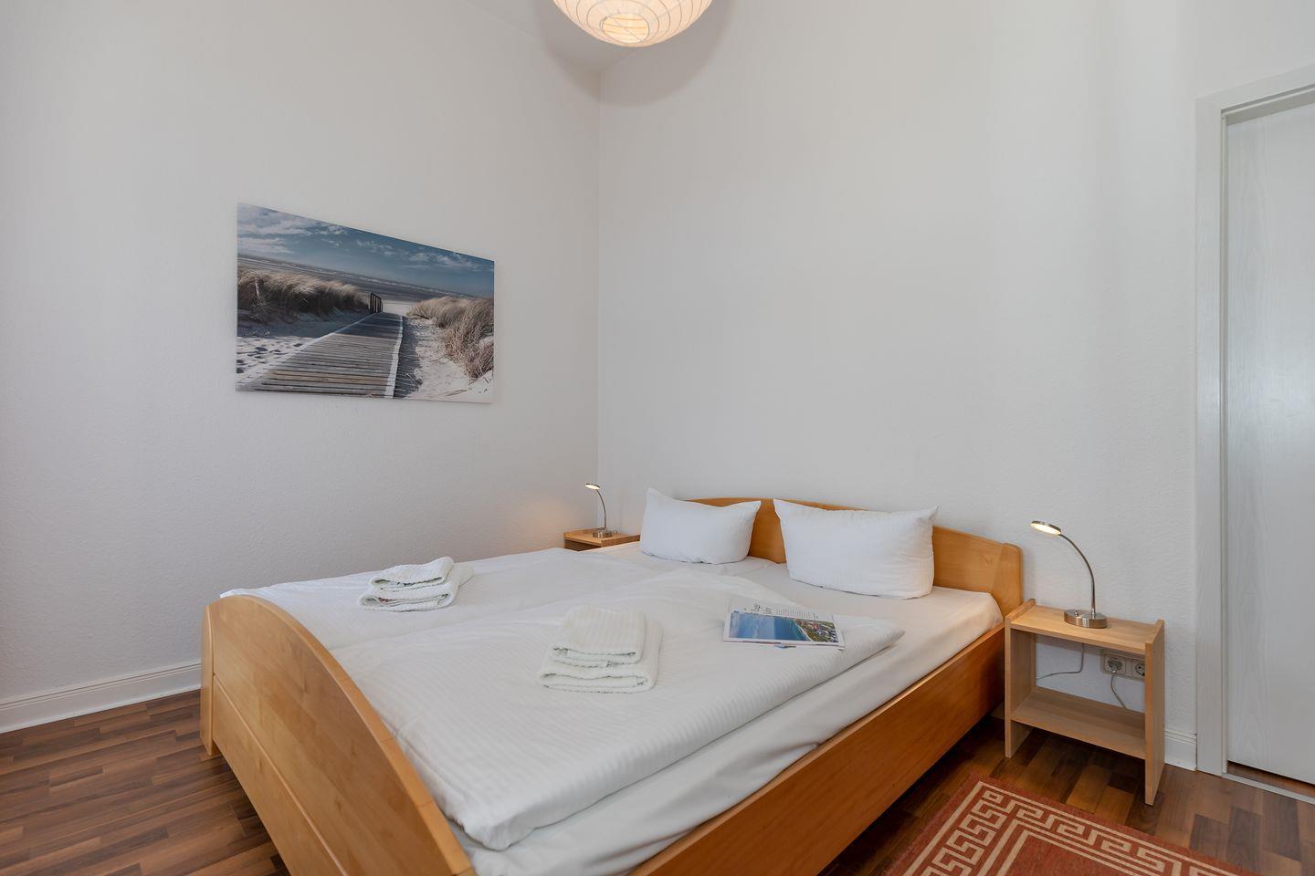 Das freundliche Schlafzimmer ist mit einem bequemen Doppelbett, Nachttischen sowie einem geräumigen Kleiderschrank eingerichtet. Eine zusätzliche bequeme Schlafmöglichkeit für eine weitere 3. bzw. 4. Person bietet die ausziehbare Schlafcouch im Wohnzimmer.