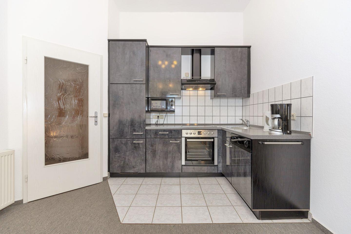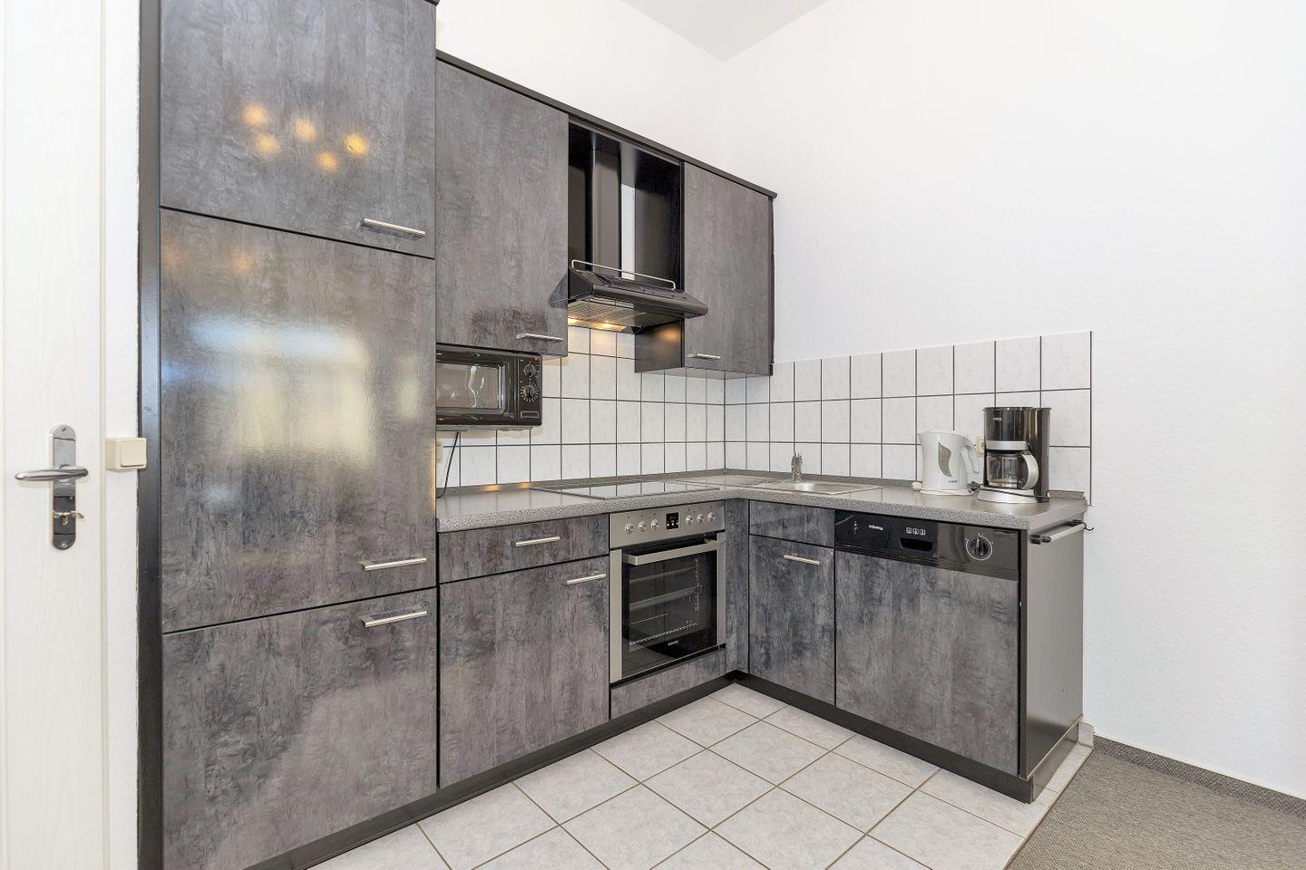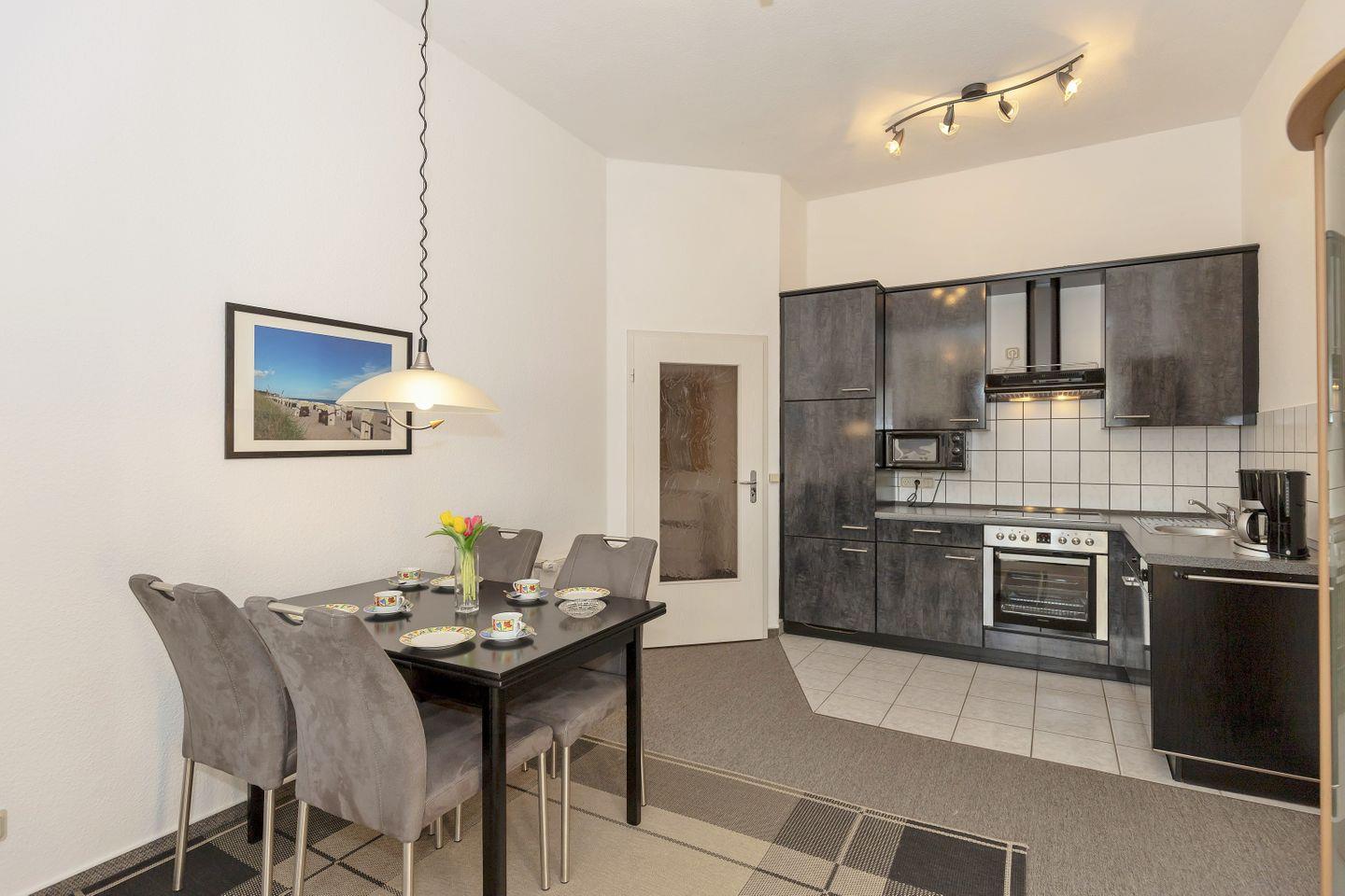 Der an den Essbereich angrenzende offene Küchenbereich beinhaltet eine voll aus-gestattete Einbauküchenzeile mit 4-Zonen-Ceran-Kochfeld, Dunstabzug, Backofen und Mikrowelle, Kühlschrank mit Gefrierfach, Geschirrspülmaschine, Kaffeemaschine, Toaster und Wasserkocher. Die Küche ist mit Geschirr, Gläsern, Besteck und Töpfen bestens und vollständig ausgestattet.
