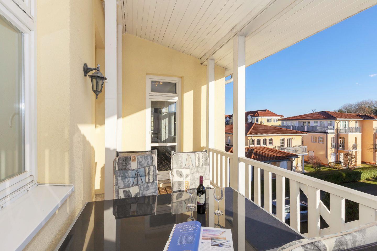 Die Wohnung verfügt über einen nach Osten (Morgensonne!) und teilweise nach Süden ausgerichteten großen und überdachten Balkon (ca. 10 m²), den Sie vom Wohnzimmer und vom Schlafzimmer aus erreichen. Hier sitzen Sie entspannt und können bei einer guten Flasche Wein die lauen Sommernächte genießen!