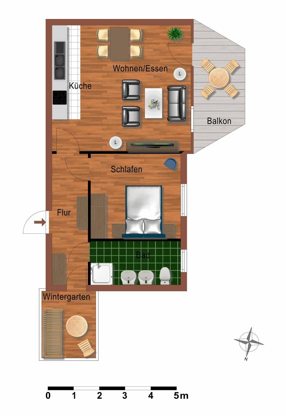 Die sehr großzügige, moderne und bestens ausgestattete 2-1/2-Zimmer-Wohnung (ca. 65 m²) im 2. Obergeschoss besitzt ein hohes Maß an Funktionalität und ist komplett eingerichtet. Der Bodenbelag in allen Räumen ist hochwertiges Vinyl-Design, im Wintergarten Holzlaminat, der Küchenbereich und das Bad / WC sind gefliest.