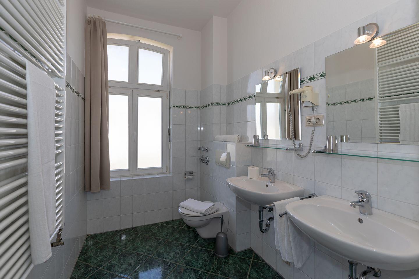 Das moderne und helle Badezimmer (mit Fenster / Tageslicht!) verfügt über eine Dusche, 2 Waschbecken, WC, Handtuch-Heizkörper sowie ausreichend Ablagemöglichkeiten.