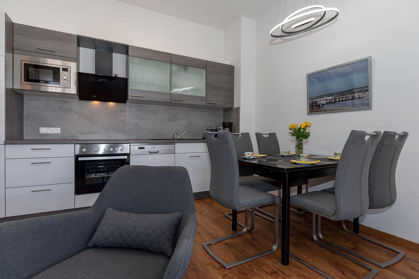 Der an den Essbereich angrenzende offene Küchenbereich beinhaltet eine neue und moderne komplett ausgestattete Einbauküchenzeile mit 4-Zonen-Ceran-Kochfeld, Dunstabzug, Backofen und Mikrowelle, Kühlschrank mit Gefrierfach, Geschirrspülmaschine, Kaffeemaschine, Wasserkocher und Toaster. Die Küche ist mit Geschirr, Gläsern, Besteck und Töpfen bestens und vollständig ausgestattet.