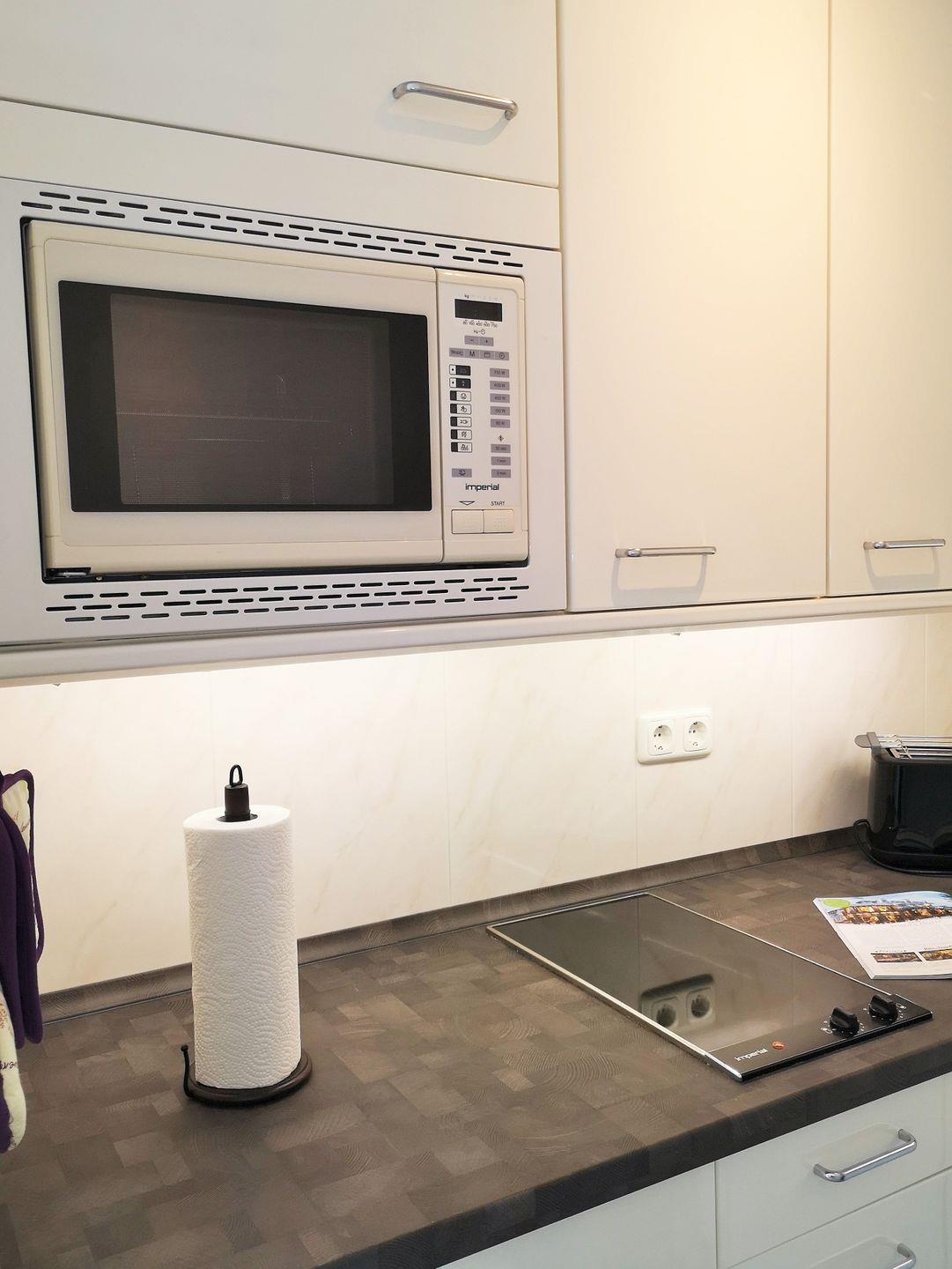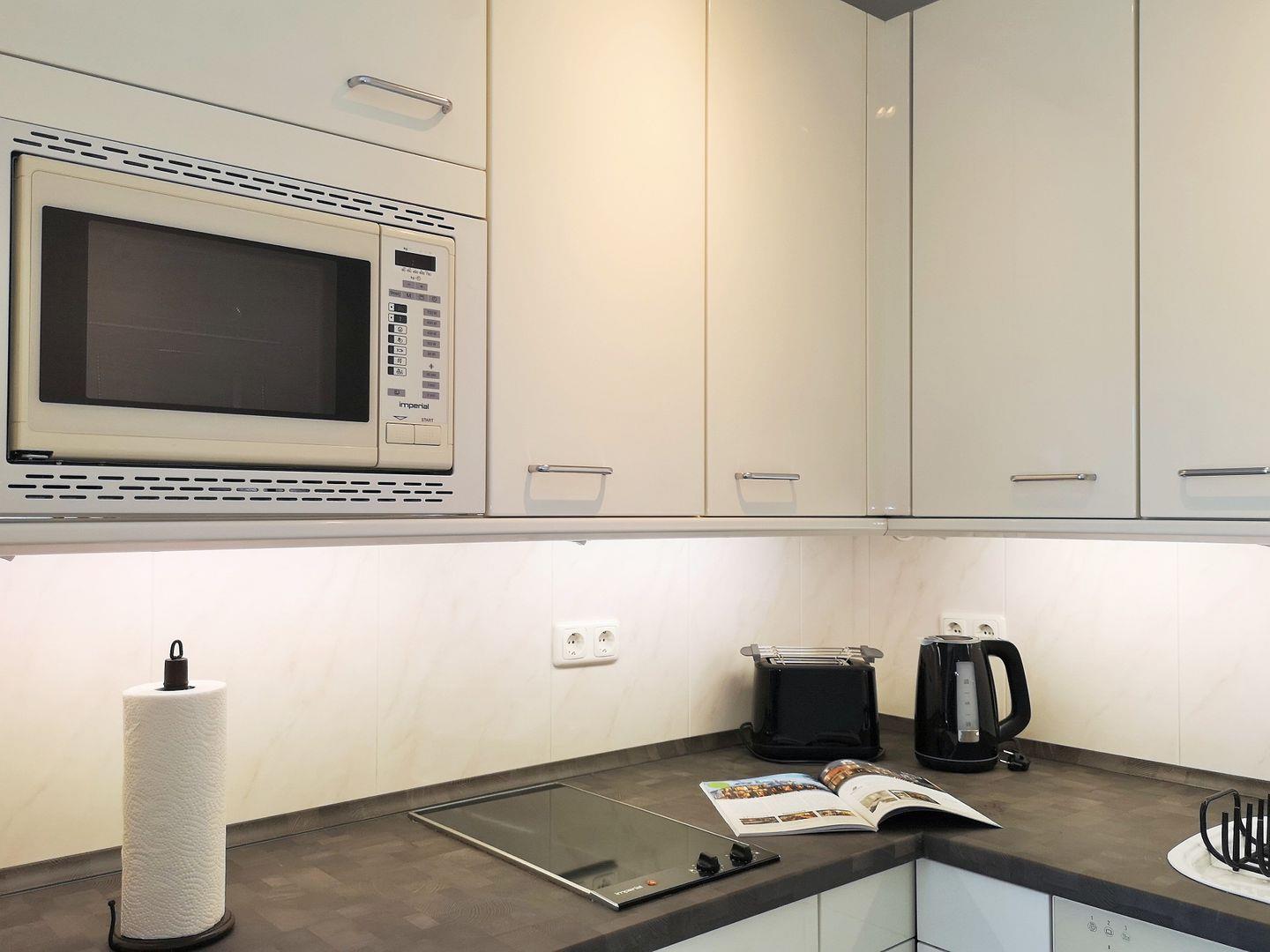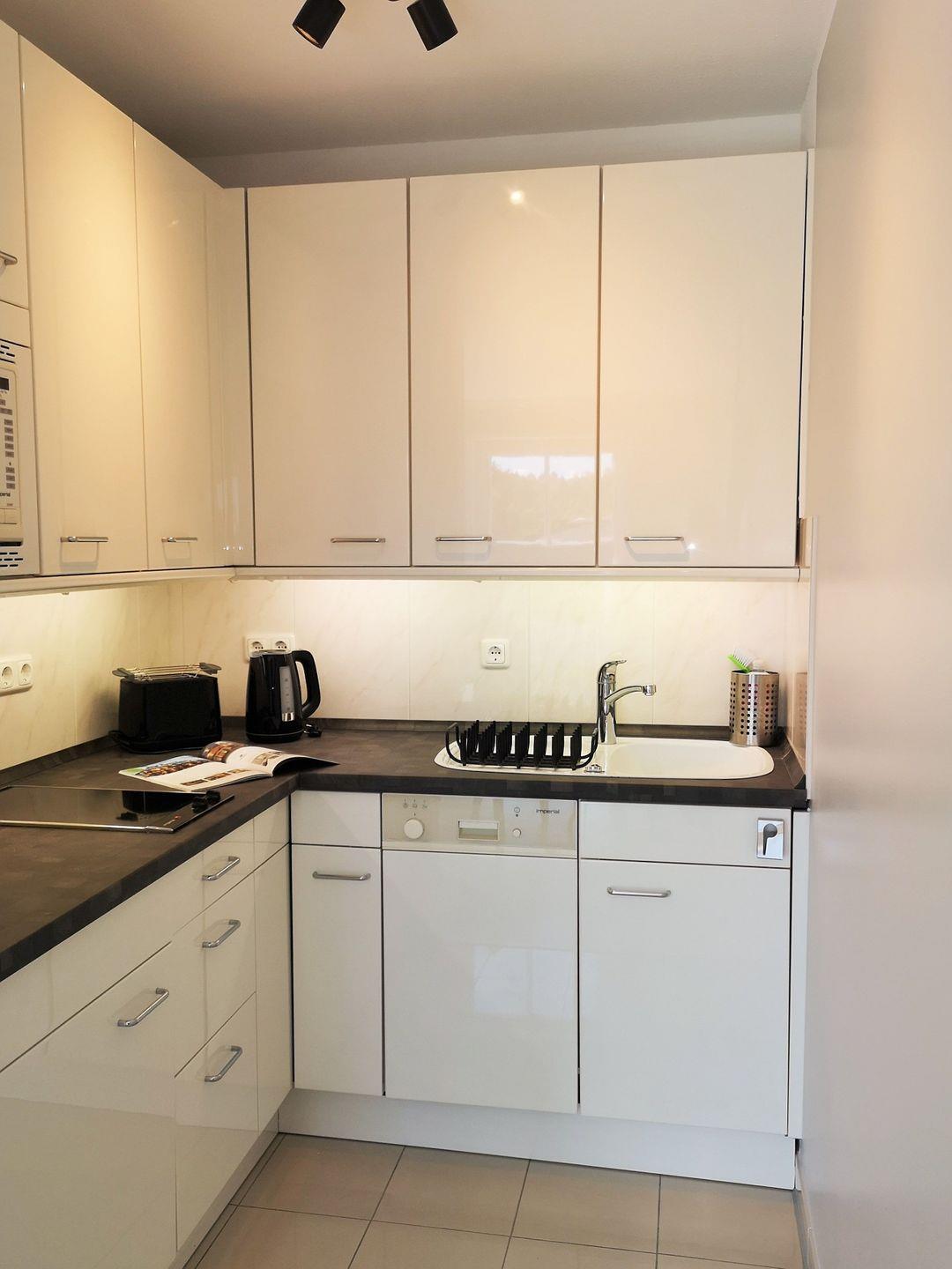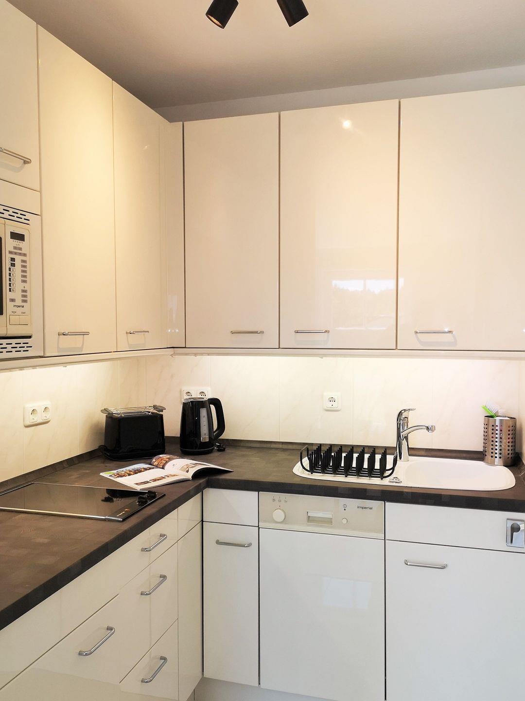 Die halb offene Küche beinhaltet eine voll ausgestattete Einbauküchenzeile mit 2-Zonen-Ceran-Kochfeld, Mikrowelle, Kühlschrank mit Gefrierfach, Geschirrspülmaschine, Kaffee-maschine, Wasserkocher und Toaster. Die Küche ist mit Geschirr, Gläsern, Besteck und Töpfen bestens und ausreichend ausgestattet.