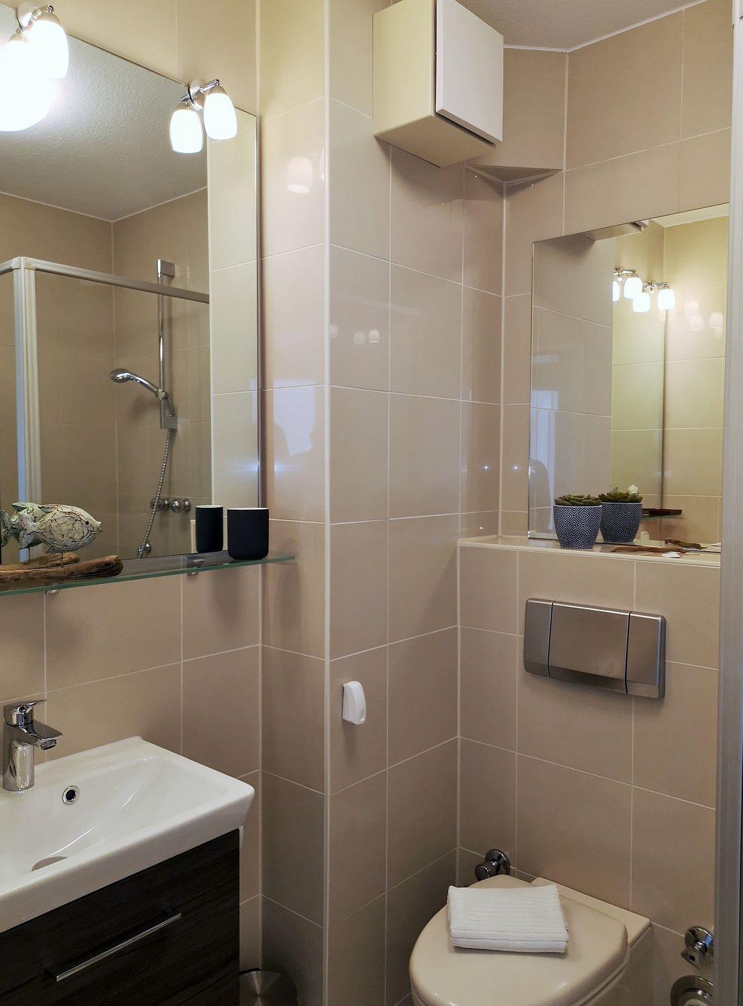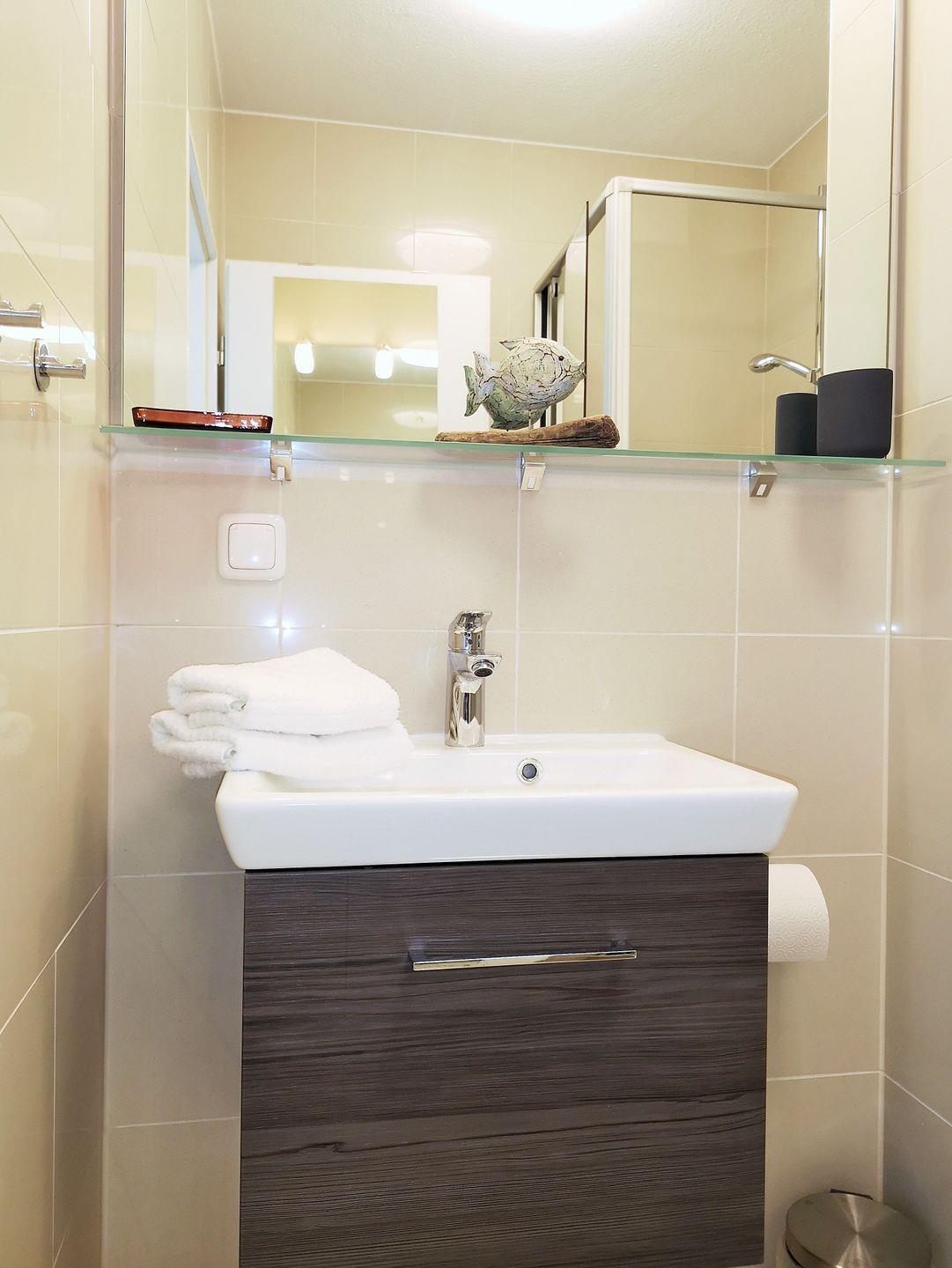 Das helle und freundliche Badezimmer verfügt über eine Dusche, Waschbecken und WC sowie ausreichend Ablagemöglichkeiten.
