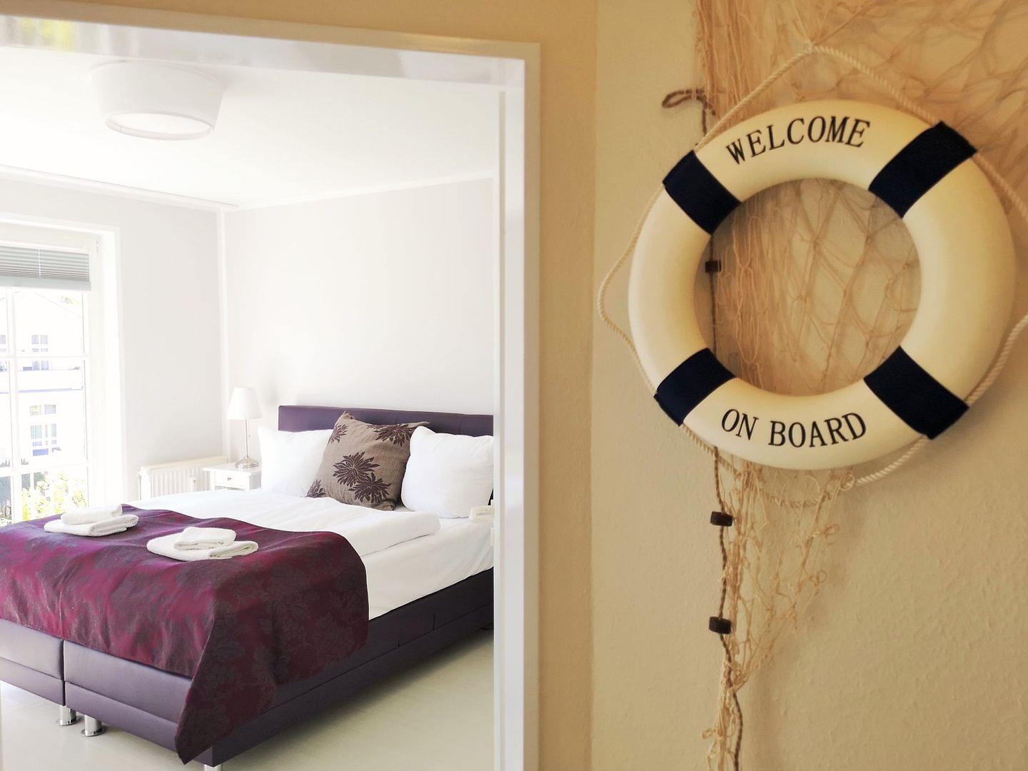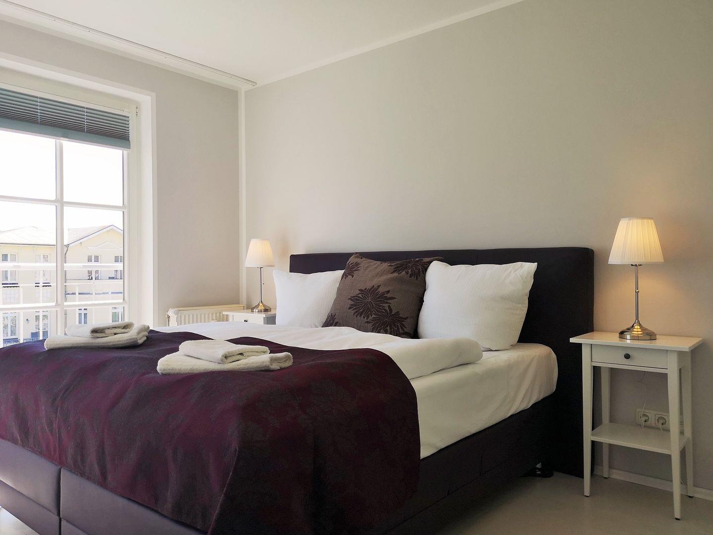Das moderne und sehr geschmackvoll eingerichtete Schlafzimmer ist mit einem bequemen Box-Spring-Bett, Nachttischen, einem großen Sideboard sowie einem geräumigen Kleiderschrank eingerichtet und verfügt ebenfalls über 2 große bodentiefe Fenster. In diesem Zimmer steht Ihnen ebenfalls ein modernes TV-Gerät zur Verfügung.