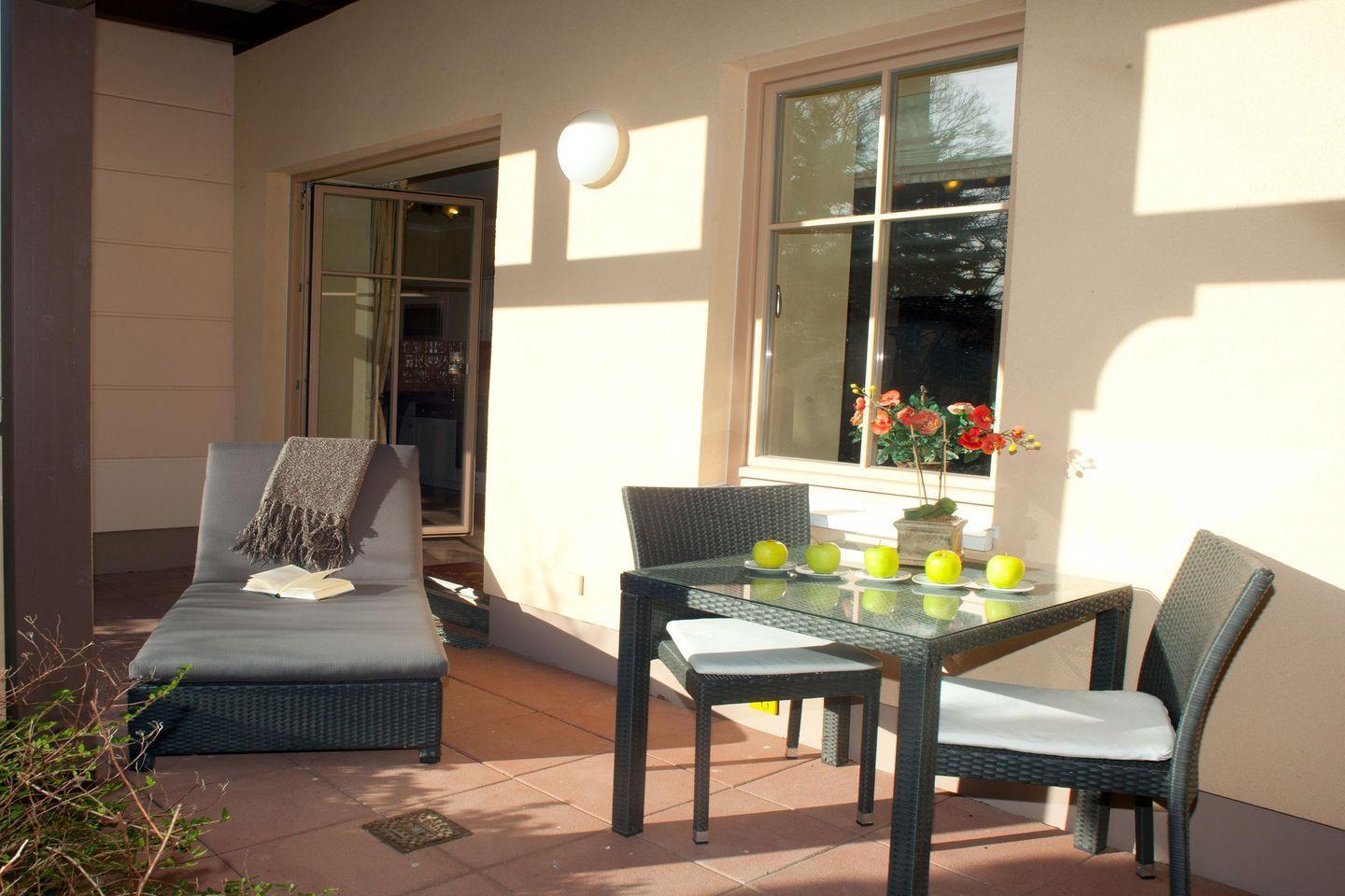 Die zur Wohnung gehörende ebenerdige und überdachte Terrasse mit bequemen Sitz- und Liegemöbeln erreichen Sie vom Wohn- und Schlafzimmer aus.