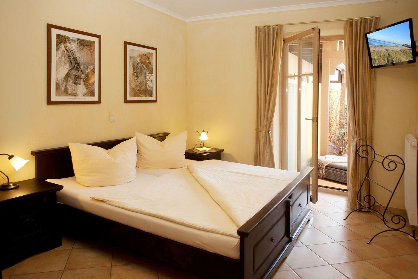 Das großzügige und freundliche Schlafzimmer ist mit einem bequemen Doppelbett, Nachttischen sowie einem geräumigen Kleiderschrank eingerichtet und hat einen separaten Zugang zur Terrasse. Eine zusätzliche bequeme Schlafmöglichkeit für eine weitere 3. Person bietet ein auf Wunsch im Wohnzimmer aufstellbares Zusatzbett.