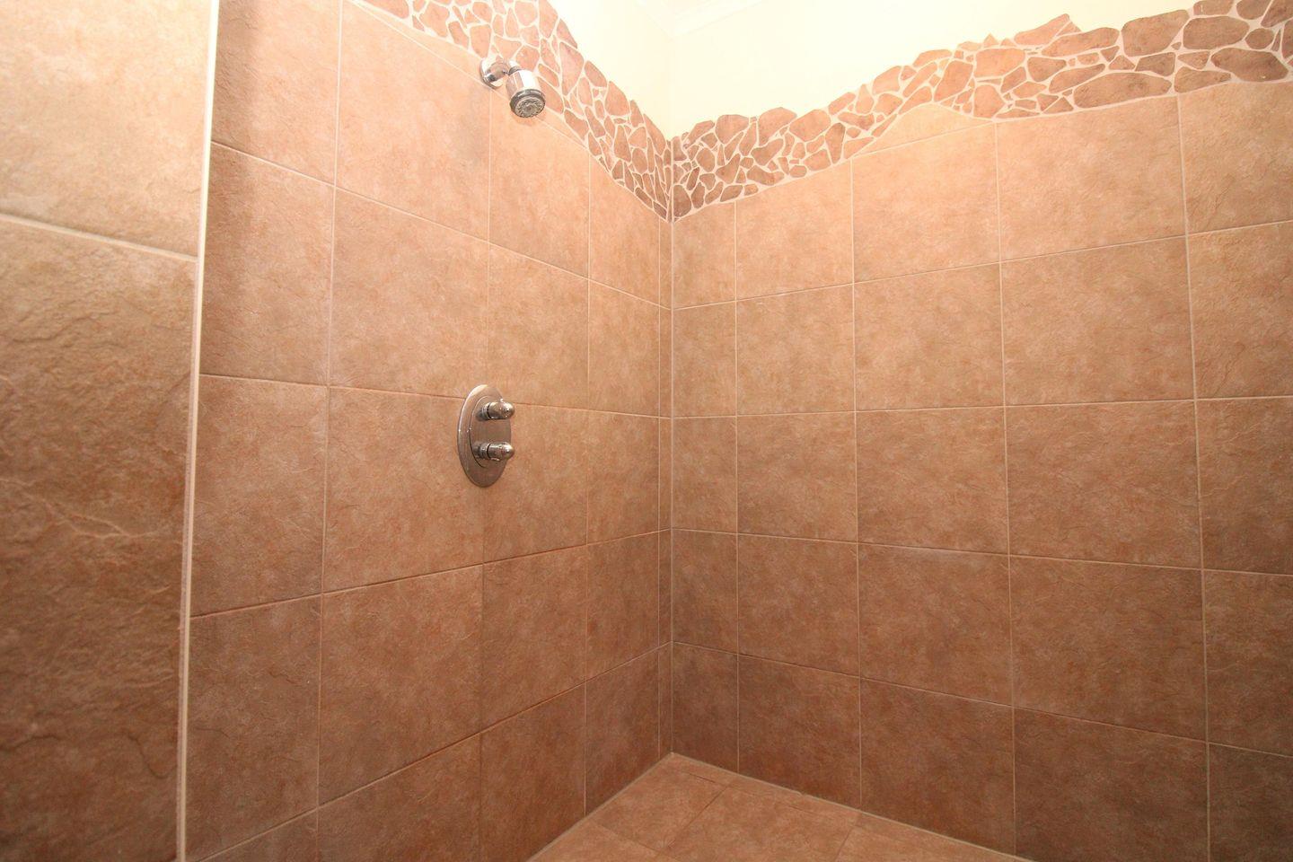 Das helle und moderne Badezimmer verfügt über eine Dusche mit ebenerdigem Einstieg, WC sowie ausreichend Ablagemöglichkeiten.