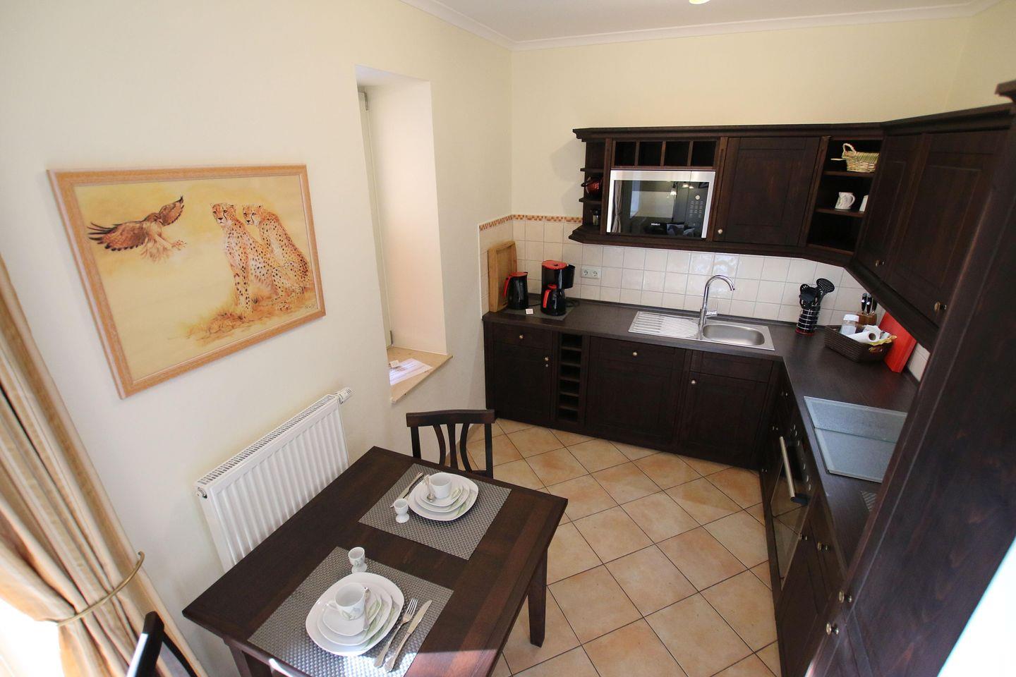 Die an den Essbereich angrenzende offene Küche beinhaltet eine voll ausgestattete Einbauküchenzeile mit 4-Platten-Ceranfeld, Dunstabzug, Backofen, Kühlschrank mit Gefrierfach, Geschirrspülmaschine, Mikrowellengerät, Kaffeemaschine, Wasserkocher und Toaster. Die Küche ist mit Geschirr, Gläsern, Besteck und Töpfen vollständig und bestens ausgestattet.