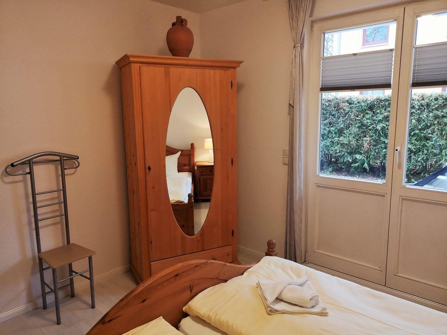 Das helle 1. Schlafzimmer ist mit einem bequemen Doppelbett, Nachttischen sowie einem Kleiderschrank eingerichtet und hat einen direkten Zugang zur Terrasse.