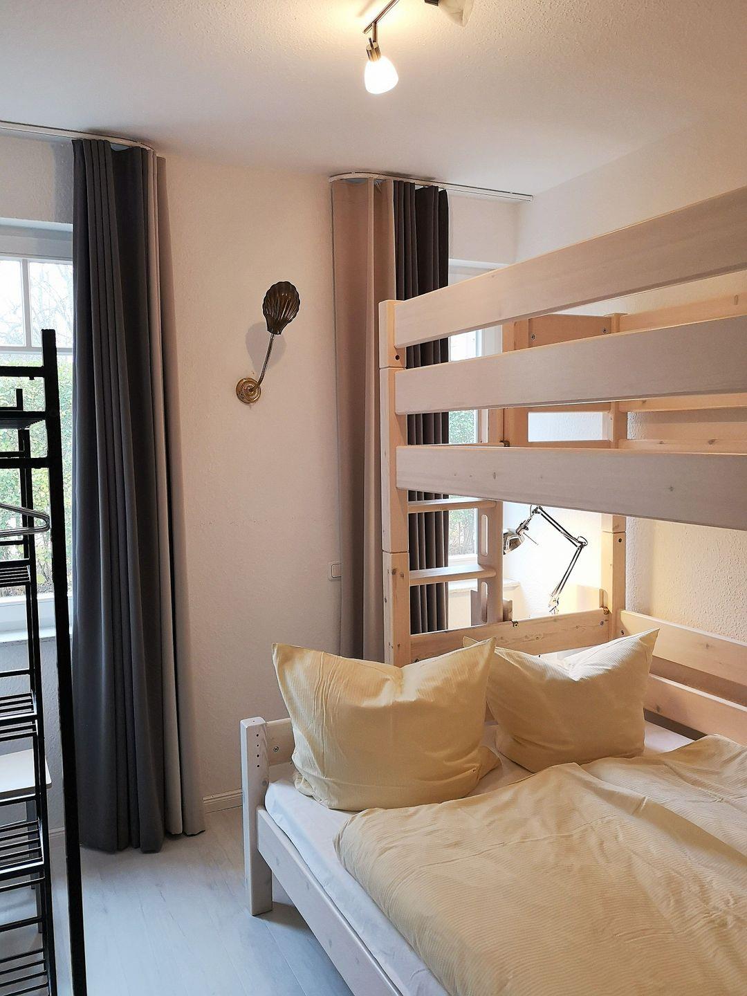 Das separate 2. Schlafzimmer verfügt über ein Etagenbett – im unteren Bereich ist das Bett 1,40 m breit und bietet 2 Personen (1 Erw. / 1 Kind) die Möglichkeit zur Nachtruhe. Der obere Bereich des Etagenbetts (1 Person) ist 0,90 m breit.