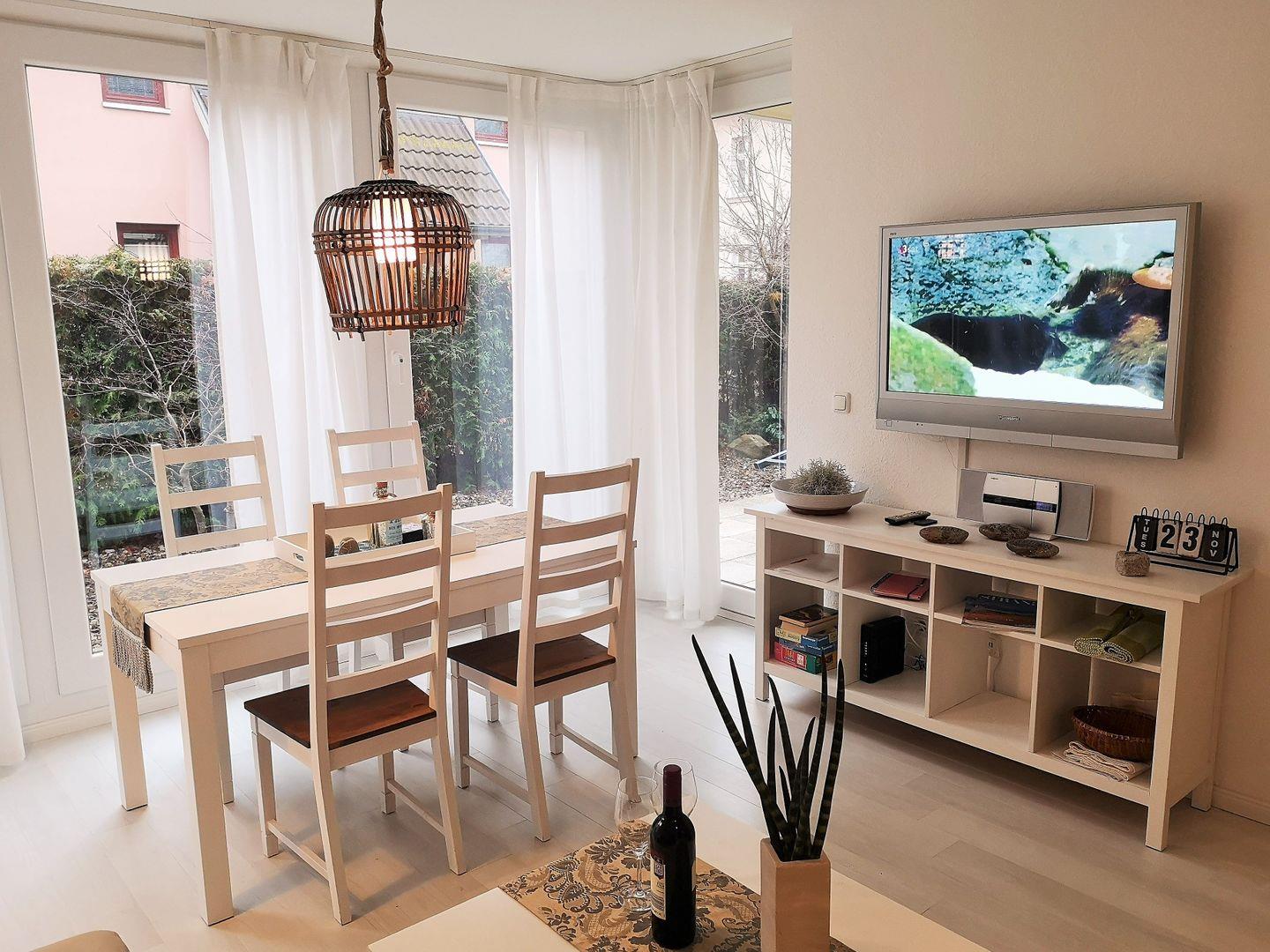 Das moderne und freundliche Wohn-/Esszimmer verfügt über eine separate Sitzgruppe mit 2 Couchen und Couchtisch, einen separaten Esstisch mit 4 Stühlen sowie ein Sideboard. Vom Wohnzimmer aus haben Sie direkten Zugang zu der ca. 7 m² großen und sonnigen Terrasse (nach Süden ausgerichtet) mit Gartenmöbeln - hier sitzen Sie entspannt und gemütlich mitten im Grünen!