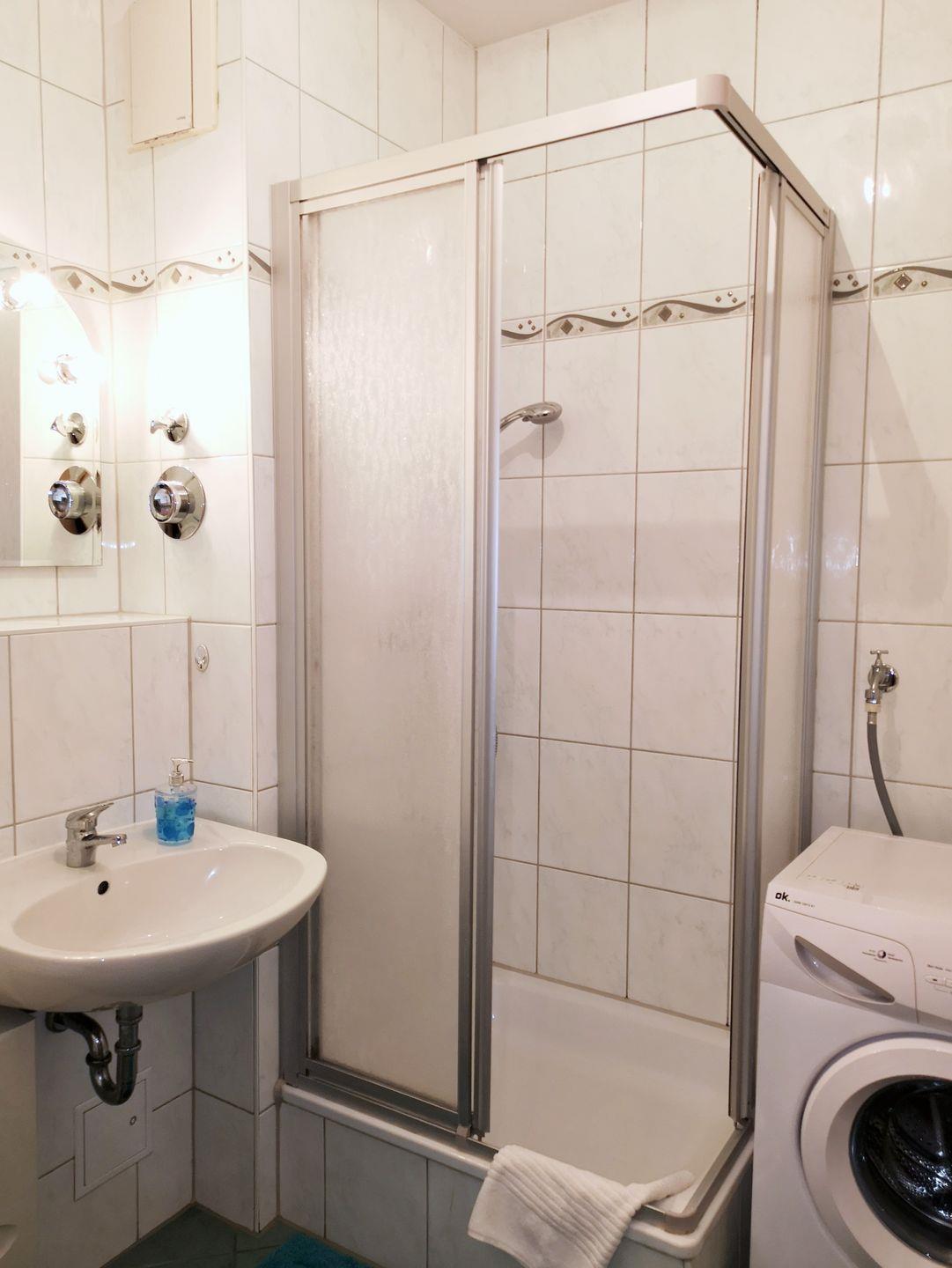Das helle und freundliche Badezimmer verfügt über eine Dusche, Waschbecken und WC sowie eine eigene Waschmaschine.