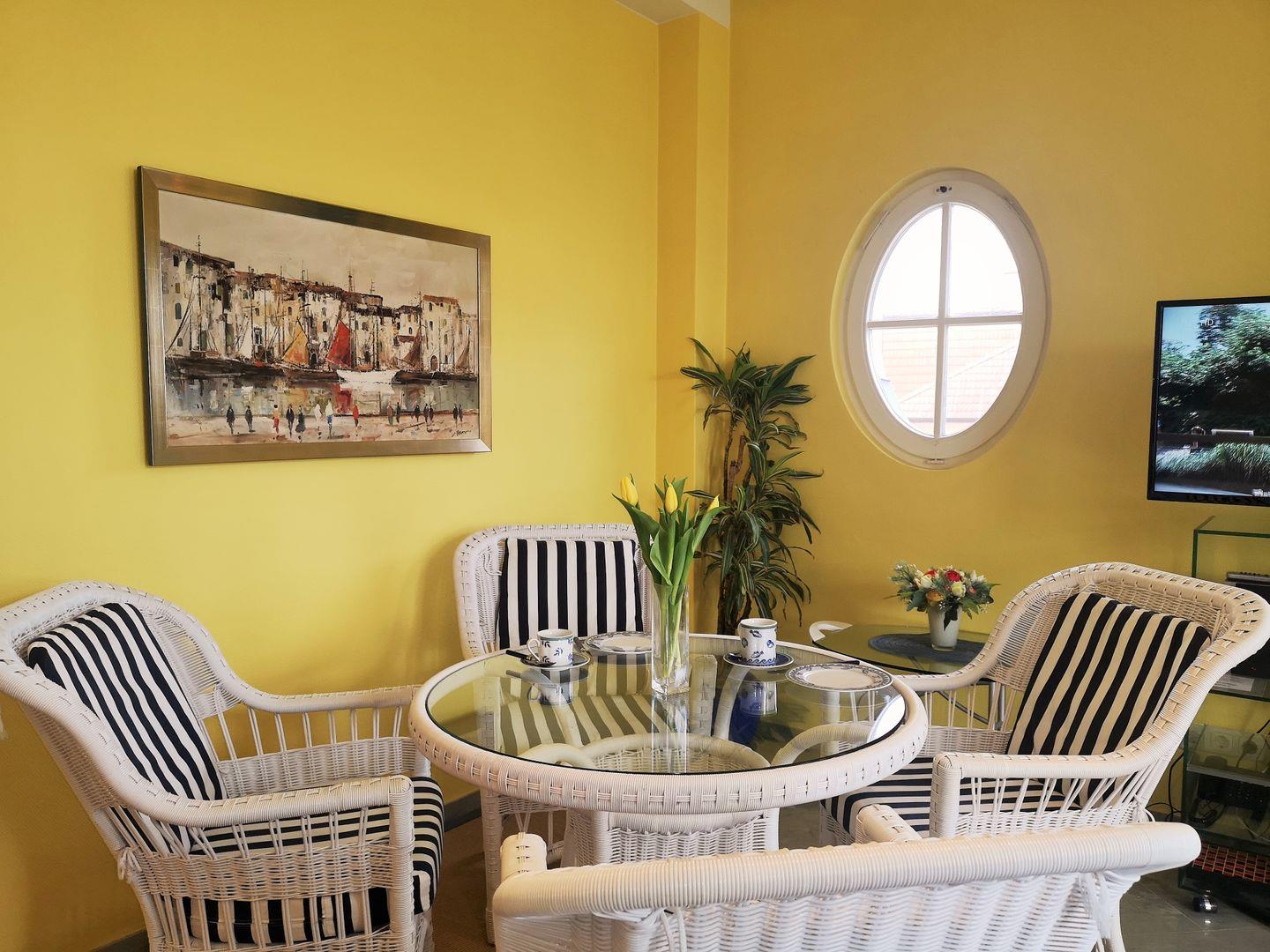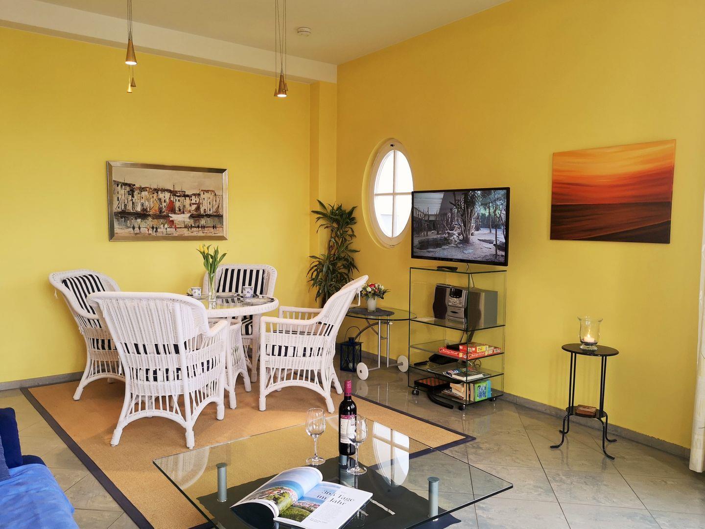 Das helle und freundliche Wohn-/Esszimmer verfügt über eine separate Sitzgruppe mit bequemer Couch, 2 Sesseln und Couchtisch sowie einen separaten Esstisch mit 4 Stühlen. Vom Wohnzimmer aus haben Sie 2 direkte Zugänge zu dem ca. 10 m² großen und sonnigen Balkon (nach Osten, Süd-Osten, Westen und Norden ausgerichtet) mit verschiedenen Balkonmöbeln und Sonnenliegen – von hier aus genießen Sie einen traumhaft schönen Blick auf die nahe Ostsee, in den unmittelbar benachbarten wunderschönen Baltic-Park sowie über die Dächer von Kühlungsborn!
