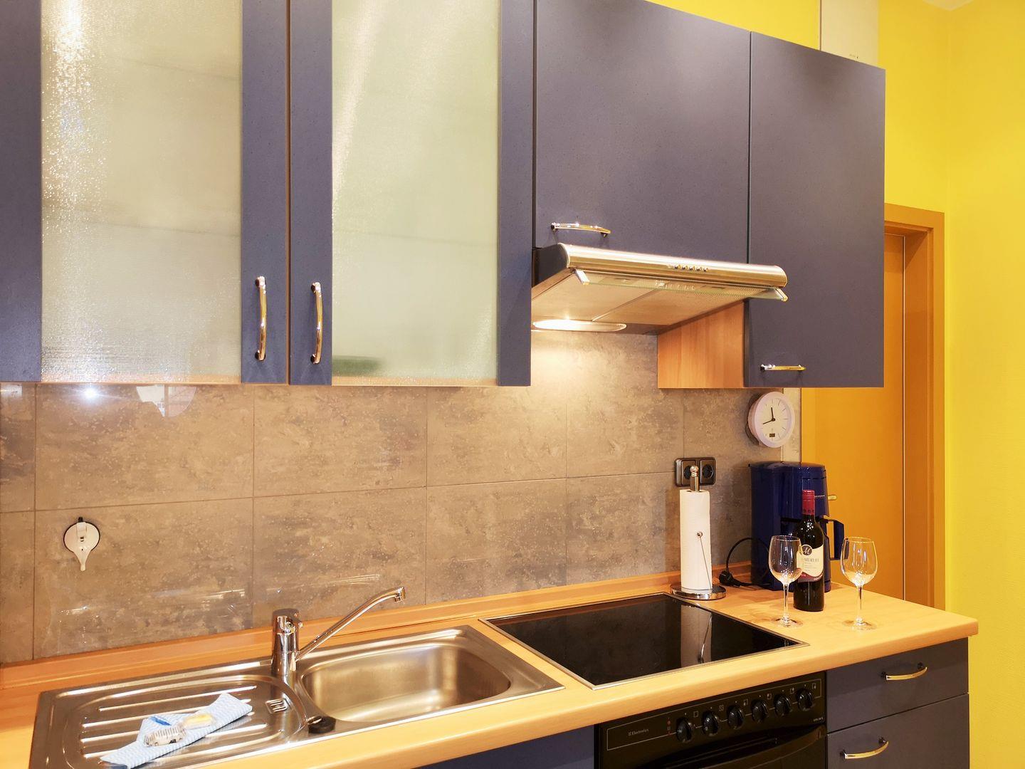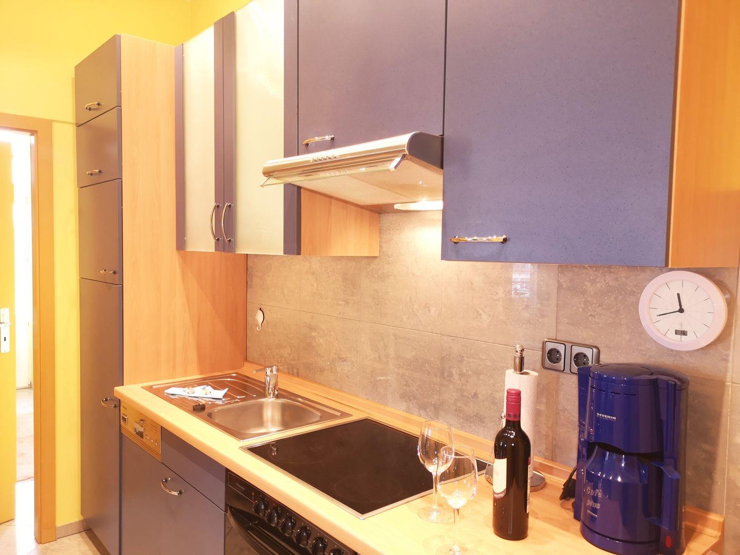 Die offene Küche beinhaltet eine voll ausgestattete Einbauküchenzeile mit 4-Platten-Ceran-Kochfeld, Backofen, Dunstabzug, Mikrowelle, Kühlschrank mit Gefrierfach, Geschirrspülmaschine, Kaffeemaschine, Kaffeeautomat (mit Tabs), Wasserkocher und Toaster. Die Küche ist mit Geschirr, Gläsern, Besteck und Töpfen bestens und ausreichend ausgestattet.