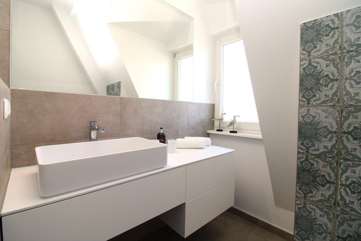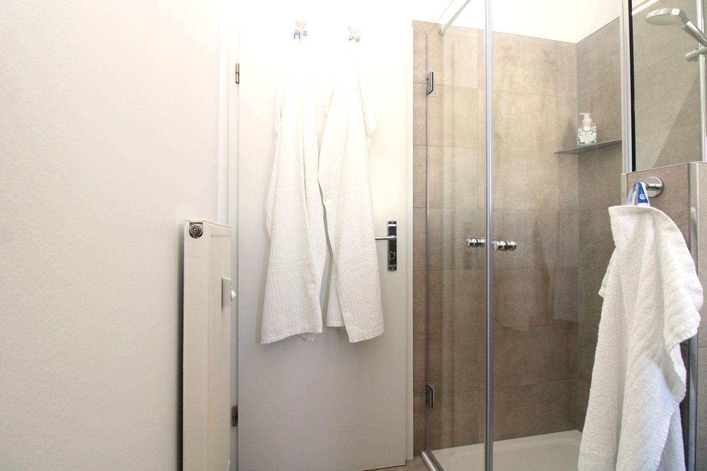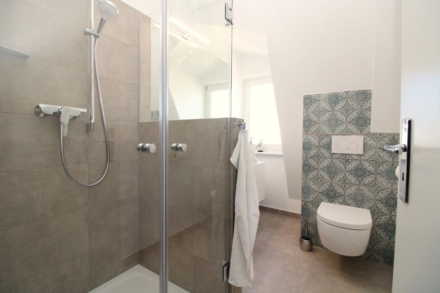 Das moderne und stylische Badezimmer (mit Tageslicht / Fenster) verfügt über eine Dusche mit bodengleichem Einstieg und Echtglas-Duschabtrennung, Waschbecken mit Unterschrank, WC, Föhn sowie ausreichend Ablagemöglichkeiten.